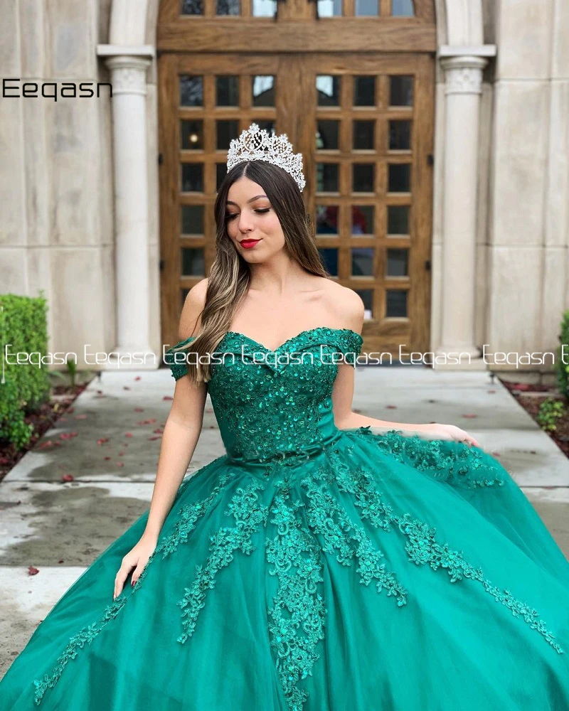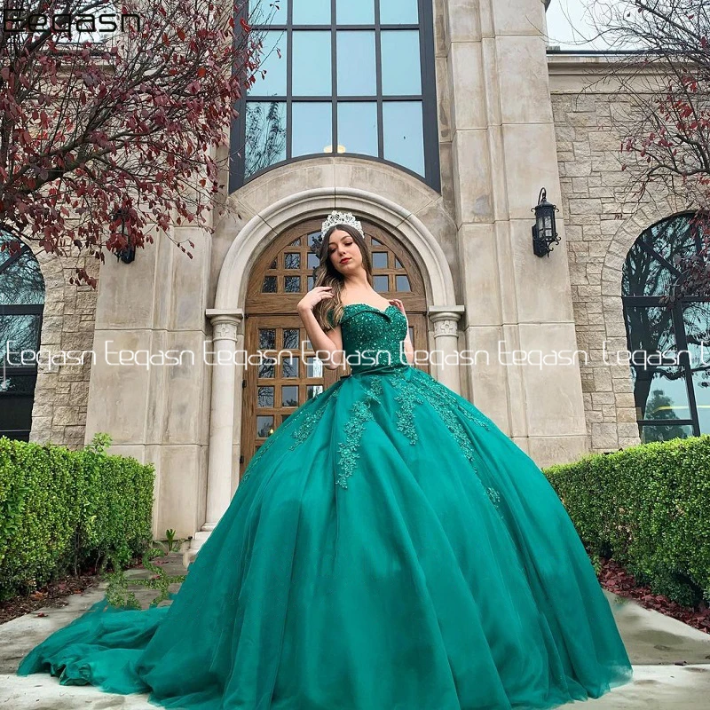 2021 зеленое платье принцессы для девушек с открытыми плечами, кружевное длинное бальное платье с аппликацией, бальное платье для выпускного вечера, пышное платье 15