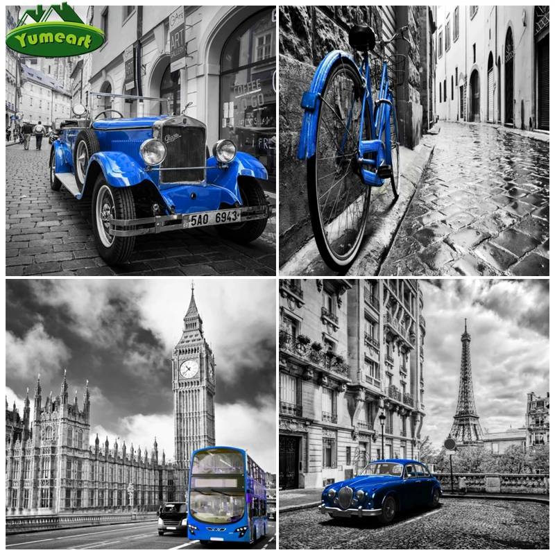 Алмазная живопись ручной работы, европейский город пейзаж, полная вышивка, распродажа, мозаика с изображением синего автобуса, автомобиля, черного и белого цветов, лондонского Парижа, здания