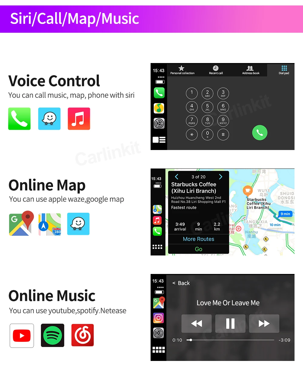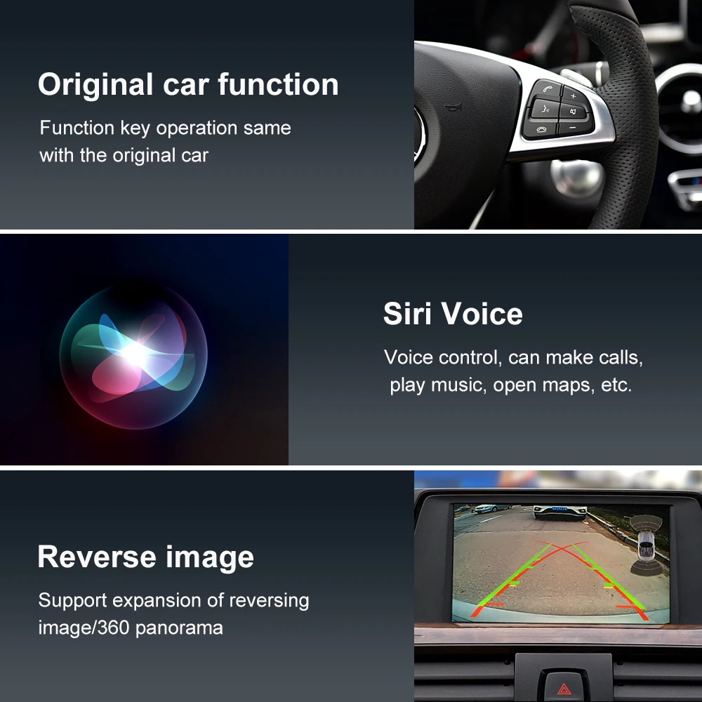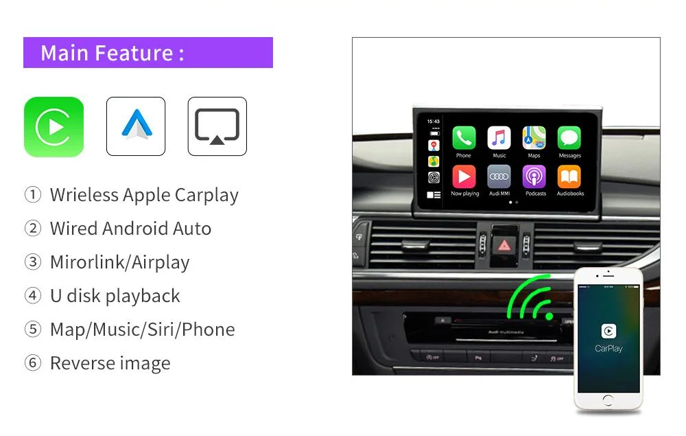 1. Беспроводная Apple CarPlay: сопряжение через Bluetooth, передача через WIFI.2. Проводной CarPlay: сначала выключите WIFI, подключите через кабель (вы также можете зарядить телефон через кабель)3. Android Auto: можно использовать Проводное и беспроводное подключение (беспроводное соединение поддерживает только некоторые мобильные телефоны)4. Зеркальное соединение: Поддержка телефонов iPhone и Android, вы можете использовать его для просмотра YouTube и других функций, доступных на любой мобильный телефон....==========================✔Поддержка для восстановления оригинального автомобиля OEM Кнопка/Управление ручкой/Управление рулевым колесом, по-прежнему оригинальный стиль вождения.✔Поддержка голосового управления: вам нужно только сказать «Hey Siri...», чтобы сделать ваш автомобиль лучше понять вас.✔Поддержка предпродажного/заднего/360 входного сигнала камеры. (Поддержка динамического руководства)✔Поддержка флеш-накопителя USB, вам нужно только вставить u-диск в usb-порт комплекта Carlinkit.✔Поддержка регулировки эквалайзера. Лучшее качество звука. Свободно Выбирайте свой любимый стиль (поп, рок, мягкий, стандартный...)✔Поддержка музыкального приложения: Spotify, Apple Music, Amazon и т. д. аудио через фабричные Audi media и некоторые приложения отображают текст.✔Поддержка gps-навигационного приложения, Google Maps, Waze и Apple Maps доступны, информация о дорожном движении в реальном времени....