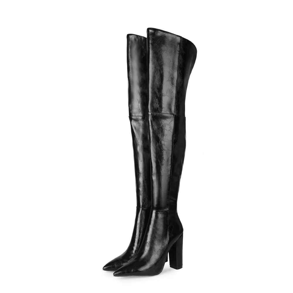 Женские ботфорты до бедра, привлекательная обувь, заостренный носок, высокий толстый каблук