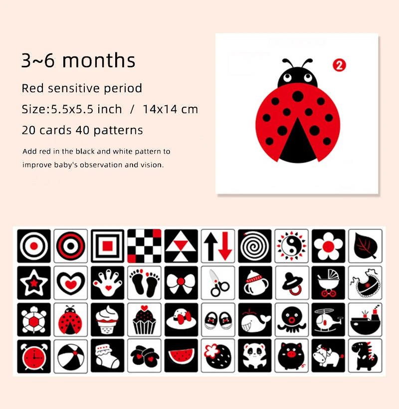 Характеристика: 1. От 0 до 6 месяцев новорожденные дети могут видеть только предметы в диапазоне от 7 до 27 дюймов, и они чувствительны к черным и белым цветам. Они проявят большой интерес к высококонтрастным картам и будут сосредоточены на картах. 2. Использование черно-белых высококонтрастных карт может стимулировать развитие мозга ребенка. Детский мозг не похож на взрослых, он способен запечатлеть быстро двигающиеся флеш-карты. По мере того, как они учатся больше в детском возрасте, их способность учиться, когда растут, будет расширена. 3. Глаз-это расширение мозга и укрепление здоровья зрительной нервной системы ребенка является частью раннего детского образования. Показ черно-белых флэш-карт для ребенка также является хорошей активностью ребенка и родителей, и это улучшает связь родителей ребенка. 4. Он использует принцип визуального постизображения, чтобы стимулировать зрение ребенка с простыми черно-белыми высококонтрастными изображениями и развивать способность младенцев находить цели и фокусироваться на обоих глазах.