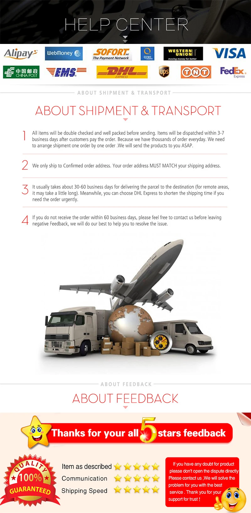 Отзывы:1) дорогой друг, ваши отзывы очень важны для нас, пожалуйста, уделите несколько секунд, чтобы оставить отличные отзывы, если вы удовлетворены нашим продуктом или обслуживанием, большое спасибо!2) мы всегда предлагаем Вам самые низкие цены на лучшие товары и услуги.3. Когда вы столкнулись с проблемой, пожалуйста, не спешите давать нам плохой обзор 1-2 звезды, сначала свяжитесь с нами, мы дадим удовлетворительный ответ в течение 24 часов.4) Пожалуйста, не оставляйте нам плохие отзывы из-за задержки доставки, потому что логистика часто не контролируется. Вы не получили товар. Мы также очень беспокоимся. Мы искренне надеемся, что каждый клиент получит удовлетворительные товары.Спасибо!Международная доставка:1. Мы отправляем товары по всему миру.2. Товар будет отправлен в течение 1-7 рабочих дней, как только ваш платеж будет проверен. Иногда дата будет отложена из-за нехватки. Однако мы сообщим вам по электронной почте.3. Время доставки: Мы не гарантируем время доставки на все международные поставки из-за различий в сроках таможенного оформления в отдельных странах, что может повлиять на то, как быстро ваш продукт проверяется. Если вы хотите более быструю доставку, пожалуйста, выберите EMS/DHL/Fedex/ UPS в качестве транспортного средства.1) Если вы не получили товар во время доставки, пожалуйста, свяжитесь с нами по электронной почте или в сообщении AlieExpress. Если у вас есть какие-либо вопросы или запросы, как правило, на вашу почту ответят в течение 24 часов. Если вы все еще не получили ответ через 24 часа, пожалуйста, проверьте спам вашей электронной почты. Мы постараемся сделать все возможное, чтобы предоставить вам лучшее решение путем общения.2). Мы отправляем товар только по адресу Aliexpress. Перед оплатой убедитесь, что ваш адрес в AliExpress совпадает с вашим адресом доставки.4. Удаленная зона доплаты: если ваш адрес принадлежит удаленной области. Мы имеем право попросить вас снова оплатить дополнительную доплату за удаленную область, даже если вы уже закончили оплату вашего заказа.Возврат/возврат (Пожалуйста, обратите внимание на следующие товары):1. Запрос на возврат или замену доступен только в течение 7 дней после получения товара и возврата товара в том же состоянии, в котором он был получен. Товары, возвращенные после 7 дней доставки, подлежат только ремонту.2. Пожалуйста, свяжитесь с нами, чтобы запросить разрешение на возврат. Укажите в электронном письме свое имя, номер заказа и причину возврата. Все возвращенные товары должны содержать все оригинальные упаковочные материалы.3. Пожалуйста, тщательно перепакуйте товар. Возвращаемые изделия проходят проверку замена высылается сразу после обнаружения дефекта. В случае отсутствия подходящей замены мы вернем вам деньги. Стоимость доставки и оформления и страховые взносы не возмещаются.4. Если товар обнаружен неполноценным, товар будет отправлен обратно покупателю за счет покупателя. Товары, возвращенные без номера RMA, будут отклонены и возвращены отправителю. Покупатель несет ответственность за все расходы по возврату и доставке. Покупатель несет ответственность за дополнительные расходы по доставке товаров, которые возвращаются в случае отказа и/или невозможности доставки. Мы не принимаем возвраты без номера авторизации на коробке или этикетке, в которую он возвращается.5. Если товары повре