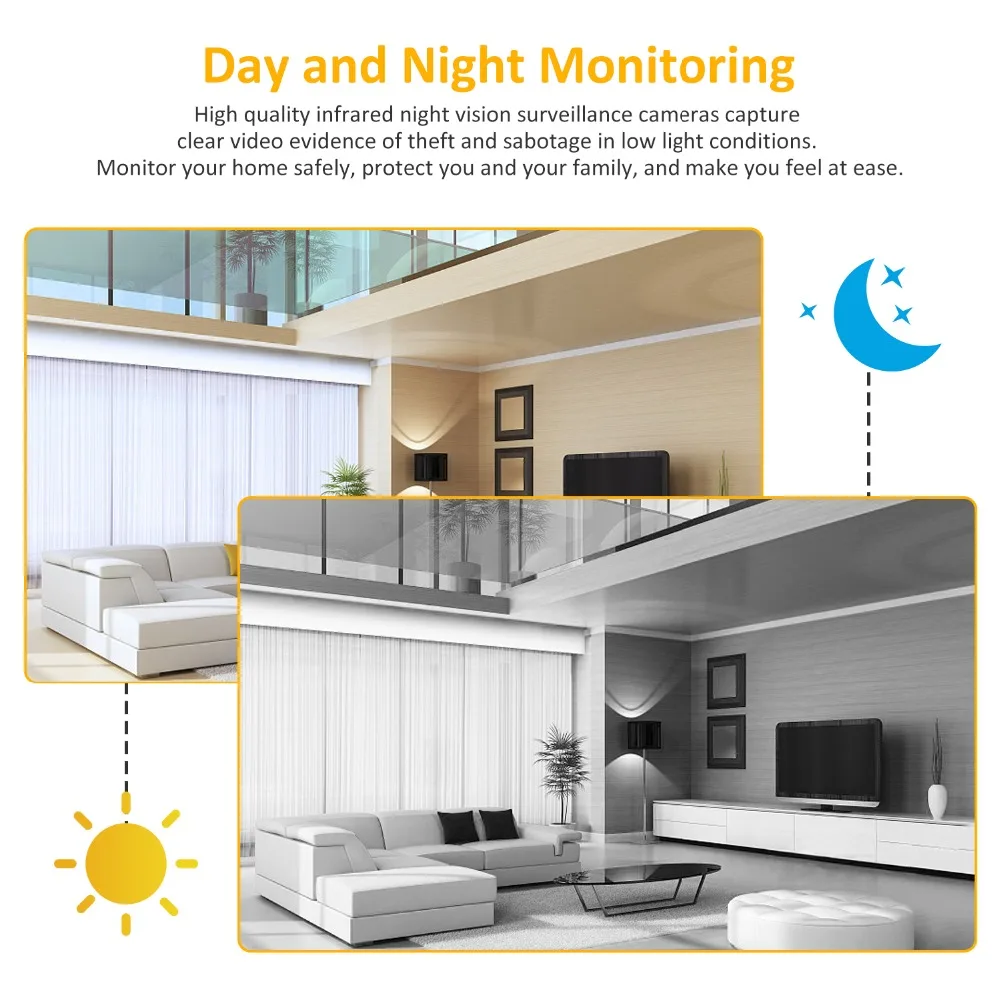 Расстояние ночного видения может достигать 30 метров. Высокое качество инфракрасные камеры ночного видения снимают четкие видео доказательства кражи и саботажа в условиях низкий светильник. Контролируйте свой дом в безопасности, защищайте вас и свою семью, и вы будете чувствовать себя комфортно.