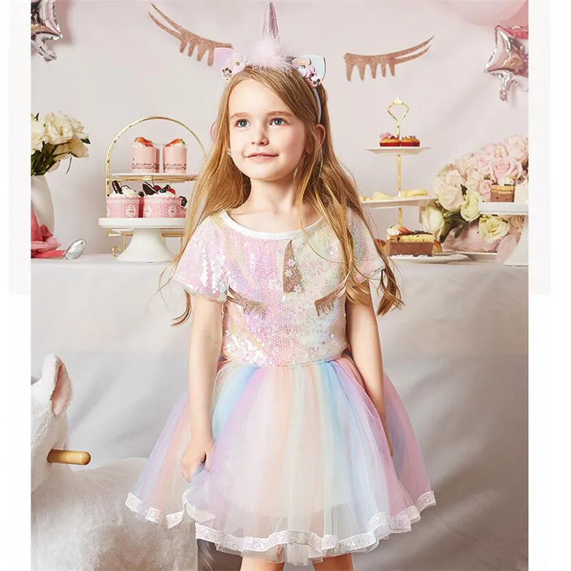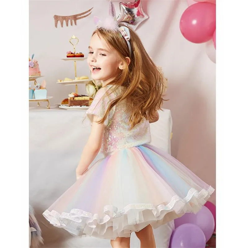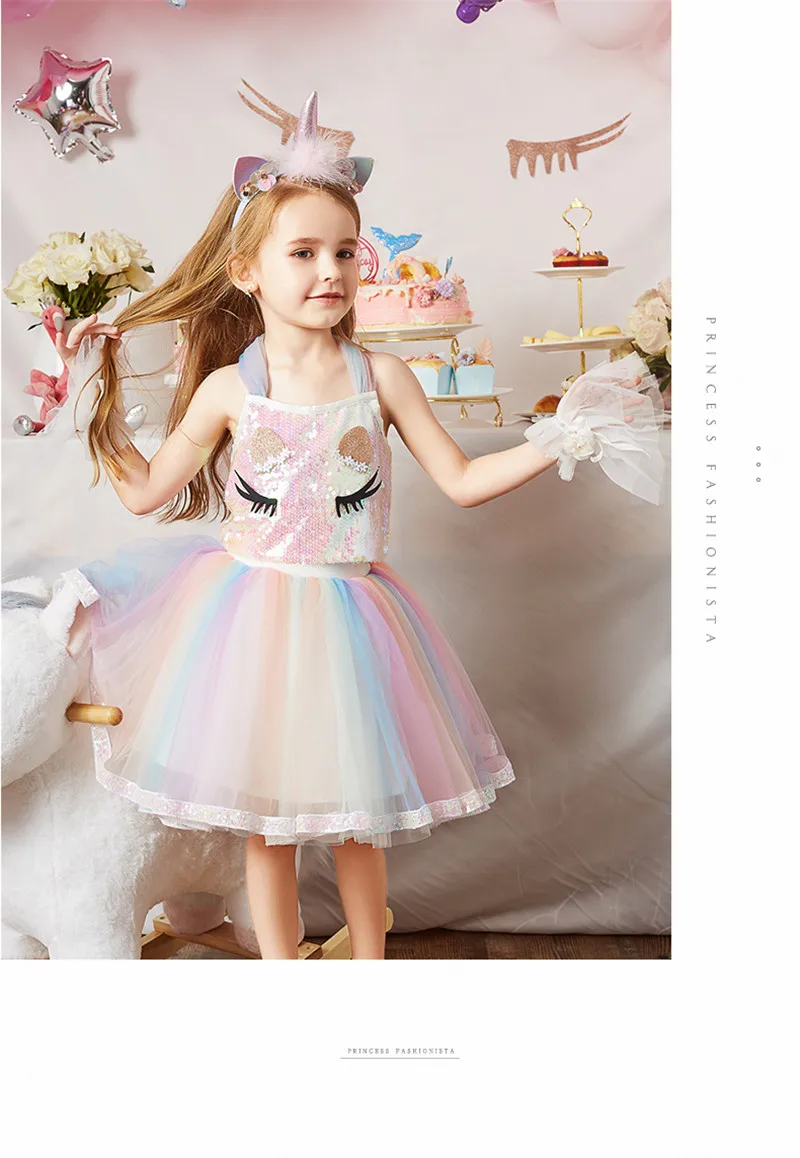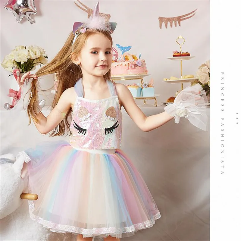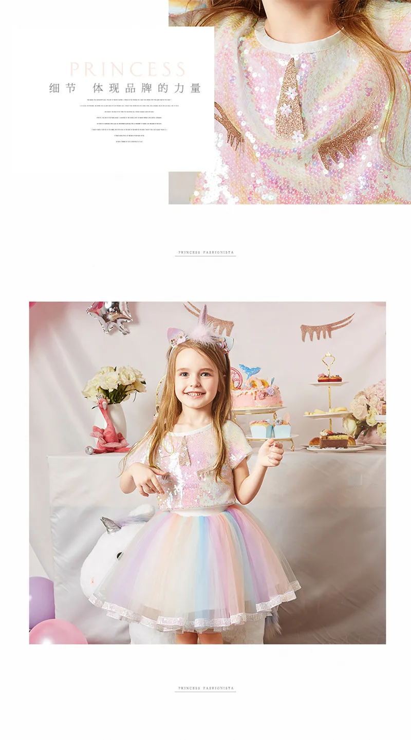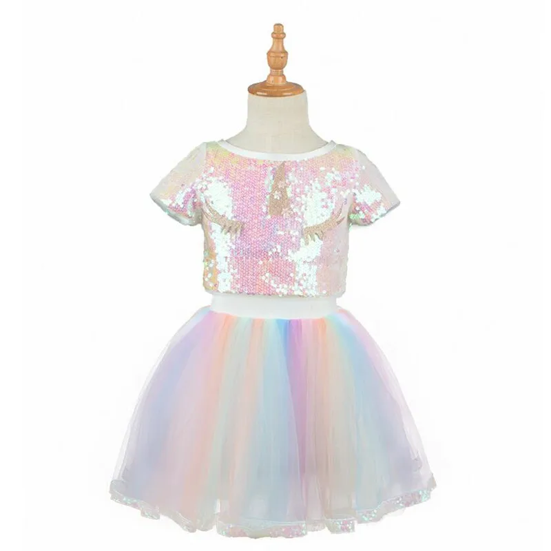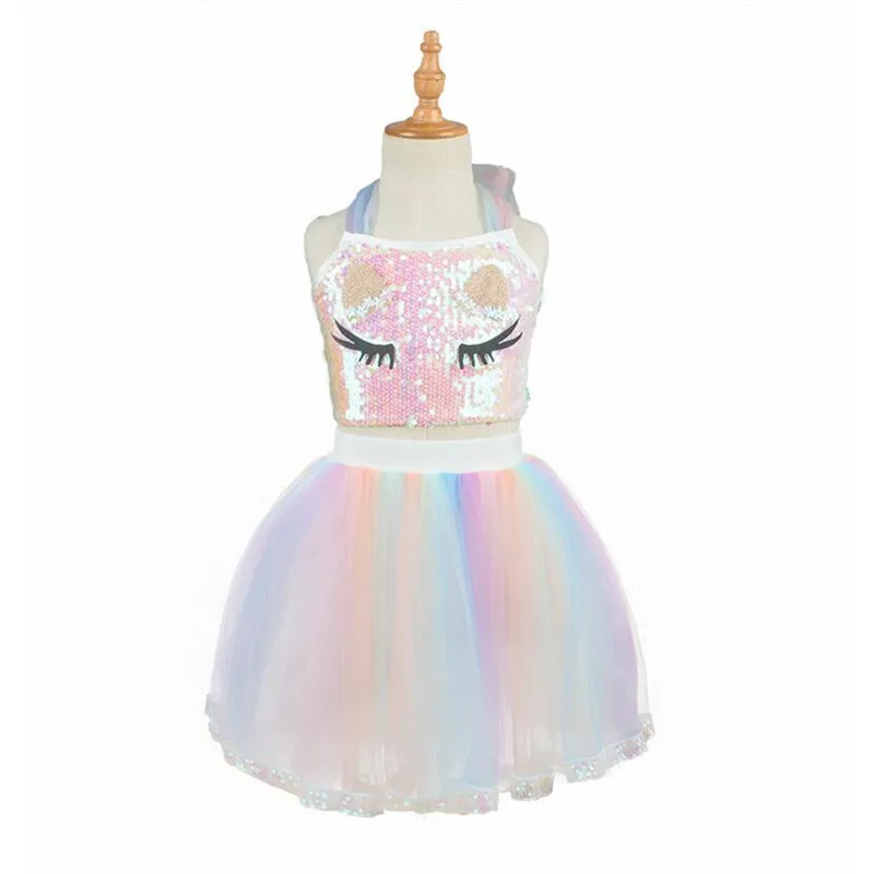 Костюм для маленьких девочек, детская одежда, новинка 2021, летняя детская футболка на бретельках с единорогом и блестками, топы и Радужная сетчатая юбка, комплект