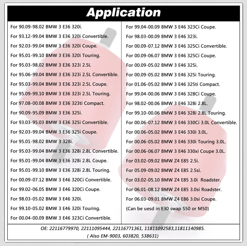 100% проверка качества, более отзывчивый, менее дорогой, более простой в установке.Мы надеемся, что вы никогда не будете иметь удар или жесткий, так как это почти всегда приводит к сломанным рычагам крепления двигателя, треснутым ушам крепления коробки передач, или еще более.Идеально подходит для занятий спортом! (цепь, дрейф...)Установка непосредственно вместо оригинальных деталей.Гораздо прочнее и жестче, чем OEM.Может быть uesd в S50 S50 или M50.Материал и цвет:
