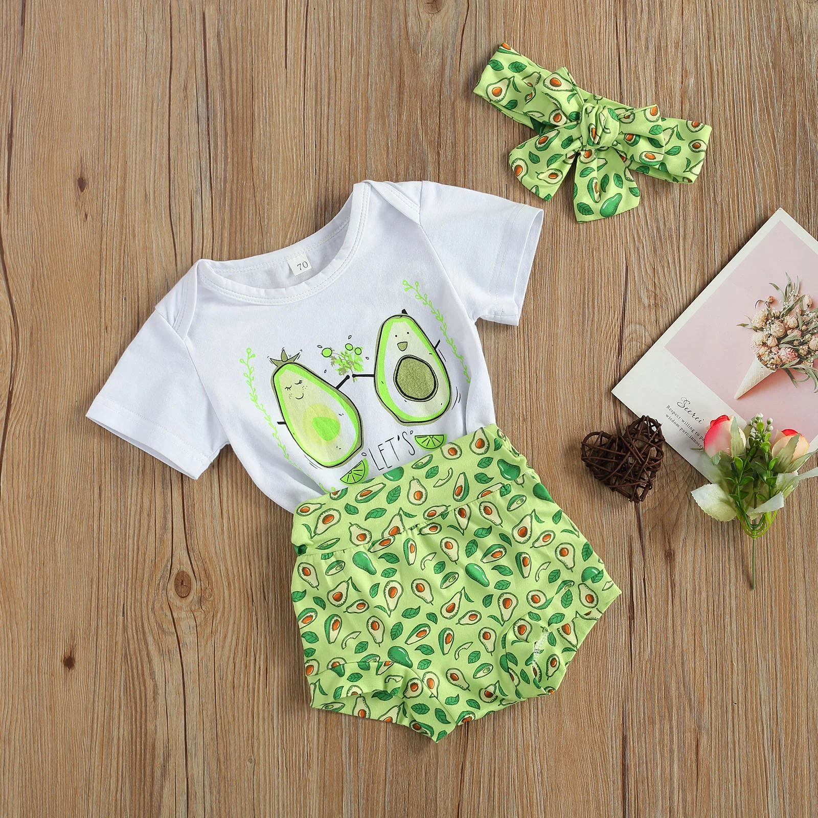 Комбинезон для девочек 0-18 месяцев, топ, штаны, костюм с принтом авокадо, рубашка с круглым вырезом и коротким рукавом, свободные летние шорты, повязка на голову