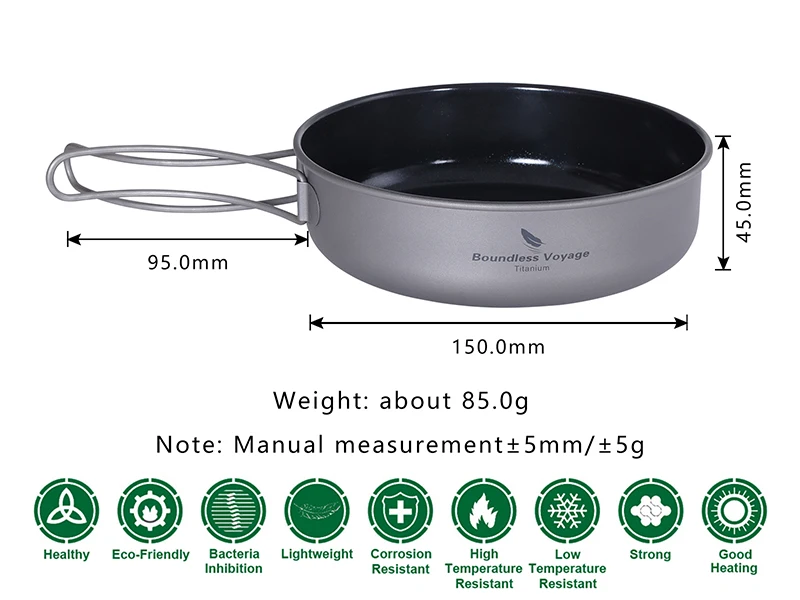 Торговая марка: Кейт походнаяМодель: Ti15169BМатериал: 99.8% титанаПокрытие: керамической глазуриРазмер: Φ150 * (в) 45 мм, толщина: 0,4 ммВес: около 85 гМесто происхождения: Китай