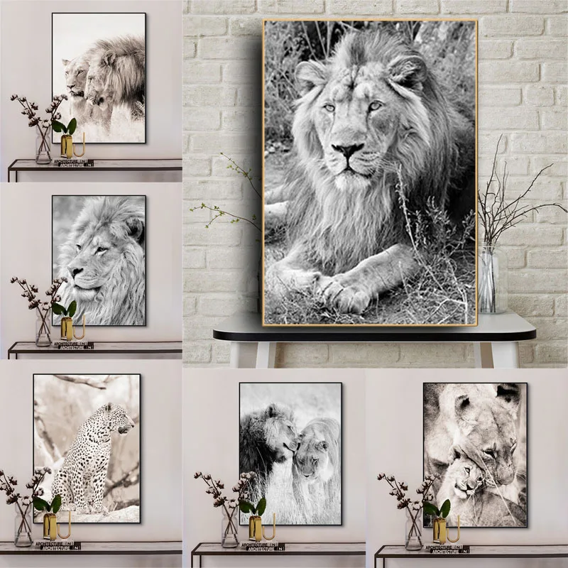 Черно-белые Львы животные Искусство Холст плакат дикий пейзаж живоп...