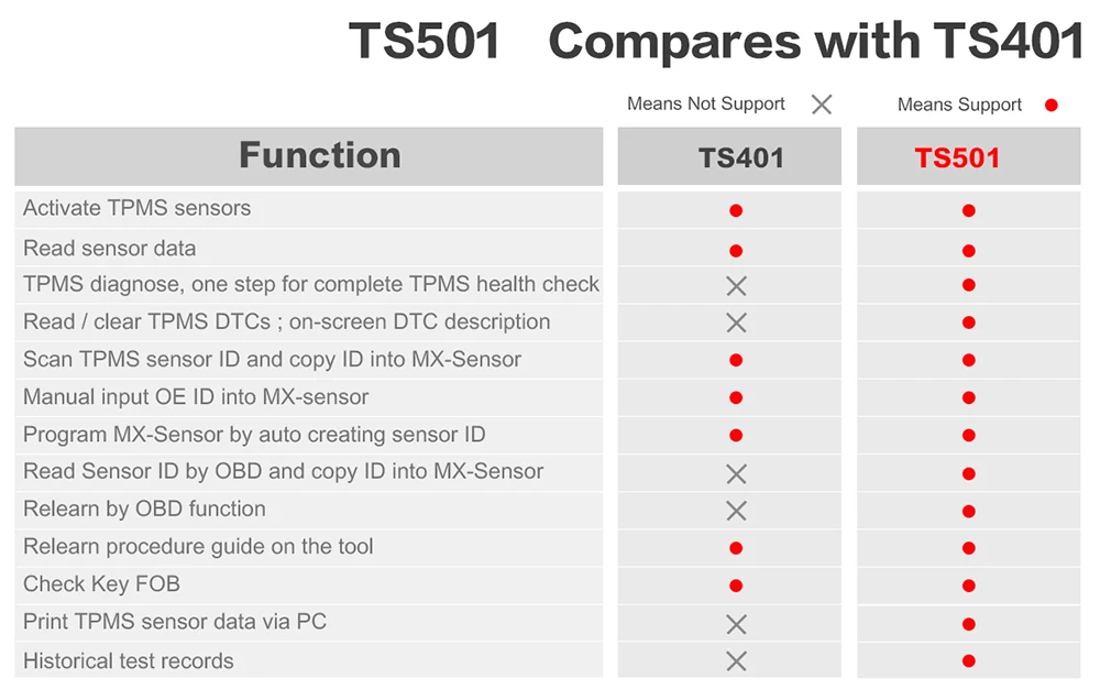 TS501 может предоставить процедуры переобучения для специальные датчики и подключиться к Эбу автомобиля с помощью шнура OBDII, чтобы предложить несколько вариантов программирования, включая идентификаторы клонирования или автосоздание идентификатора, или идентификаторы датчиков записи вручную без повторного обучения датчика, необходимого для позиционирования датчика.