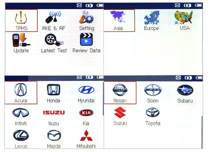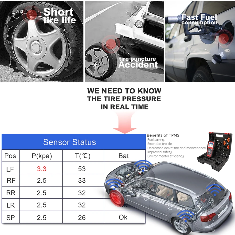 Организация с одним экраном позволяет легко читать прямые отзывы со всех 4 датчиков, четко понимать состояние всех функций TPMS, сравнивать данные датчиков и ECU, затем мгновенно выявите системные неисправности, чтобы определить исправление. Этот взгляд на всю информацию о датчике легко показывает, где разряжен аккумулятор датчика, и его необходимо в ближайшее время заменить.