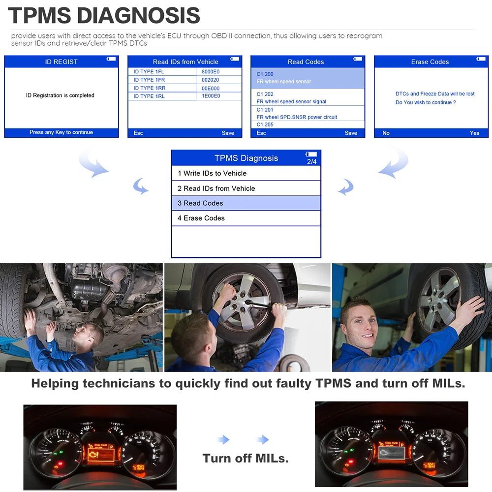 Программирует ЭБУ автомобиля для изучения идентификаторов датчиков и положений, активирует датчики срабатывания магнитных, частотных и дефляционных шин с использованием непрерывных или модулированных волновых сигналов 125 кГц, получая 315 МГц, Сигналы 433,92 МГц и 309 МГц считывает идентификатор датчика с автомобильного ЭБУ считывает/очищает коды Системы TPMS и сбрасывает светильник индикатор неисправности Встроенная перезаряжаемая литий-ионная батарея определения кодов на экране упрощает процесс диагностики, включая четыре и пять колесных транспортных средств, показывая графики транспортных средств, декодирует данные датчиков и обеспечивает визуальные и звуковые отклики для подтверждения Датчики работают должным образом, интерпретируя данные, включая идентификатор датчика, давление в шинах, температуру, состояние батареи и номер оригинальной детали. Процесс предварительного выбора обеспечивает более быструю активацию и диагностику точных результатов диагностики-пользователи могут довериться пожизненному бесплатному обновлению в интернете через USB-порт простой в использовании с интуитивно понятной навигацией и пошаговыми шаг на экране