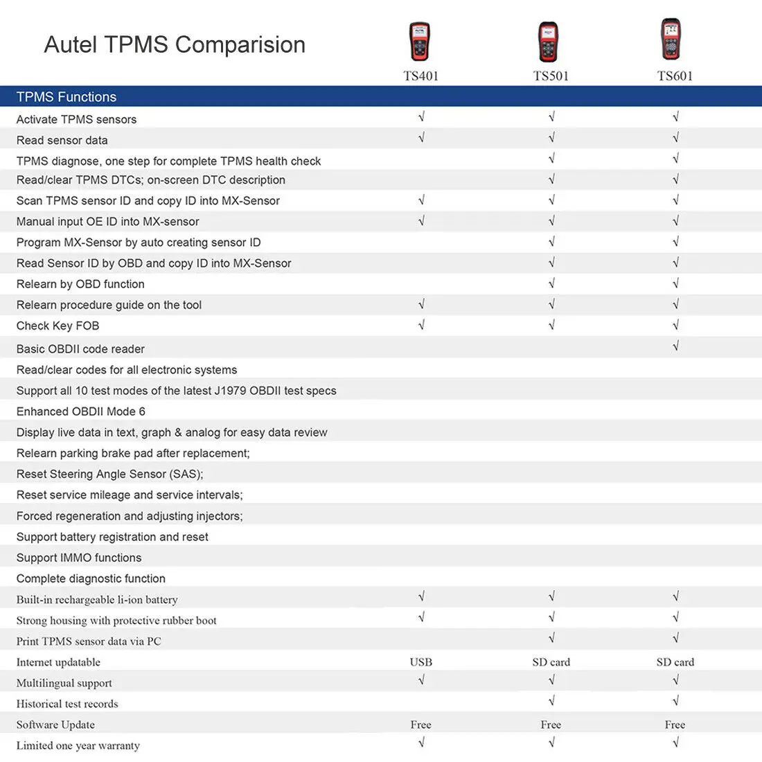 Выполнение базовой активации датчика или сложных функций диагностического инструмента, легко, как следуют параметрам программы и инструкциям на экране. TS501 обеспечивает определения кода и визуальные/звуковые отклики, чтобы сделать операции намного проще и удобнее в завершении. Скачайте Бесплатные обновления ПО для расширенных диагностических функций и расширенного покрытия автомобиля. Теперь даже ваш старый инструмент TPMS может работать как новый!