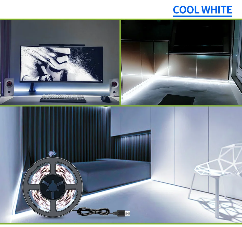 Особенности:*Гибкий светодиодный светильник-полоска, чип высокой яркости, хороший светильник, равномерный и достаточный светильник, решить проблему неравномерного освещения, сделать светильник эффект ing полон жизненной силы, отличный декоративный эффект создает комфортную атмосферу.*Управляется любыми устройствами с выходным usb-портом 5 В, такими как компьютер, настольный компьютер, ноутбук, планшет, таб, автомобильный прикуриватель. И т. д.*3M двусторонний скотч на задней части для гирлянды, может быть напрямую и быстро вставить.*Светодиодный чип высокой цветопередачи, высококачественный светодиодный чип 2835SMD, высокая цветопередача, низкий светильник, долговечный.