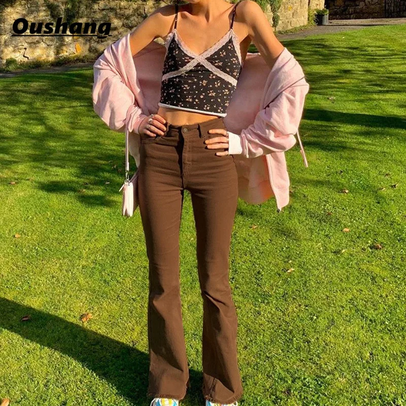 Женские расклешенные джинсы, винтажные коричневые брюки-клеш Y2k, о...