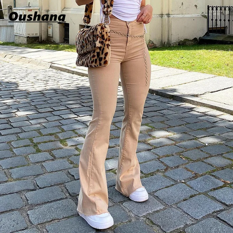 Женские джинсы в стиле Харадзюку, коричневые эластичные расклешенны...