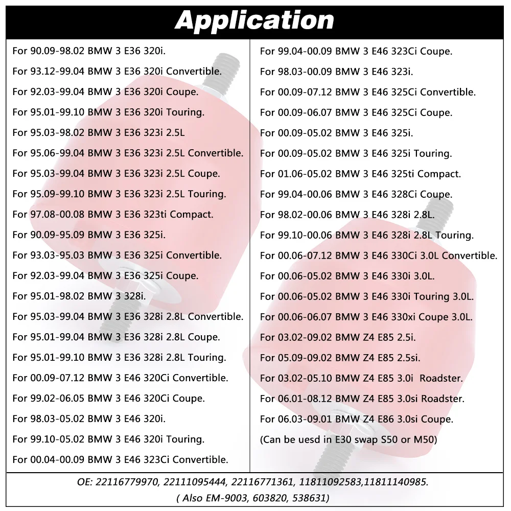 100% проверка качества, более отзывчивый, менее дорогой, простой в установке.Надеюсь, у вас никогда не будет удара или жесткого выключения, так как это почти всегда приводит к сломанным креплениям двигателя, треснутым ушам крепления трансмиссии или еще хуже.Идеально подходит для занятий спортом! (цепь, дрейф...)Установка непосредственно на месте оригинальных деталей.Намного прочнее и жестче, чем OEM.Может использоваться в E30 своп S50 или M50.Материал и цвет: