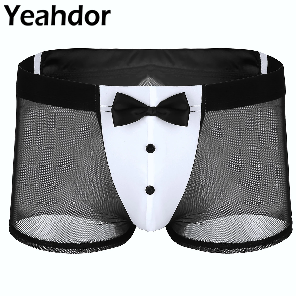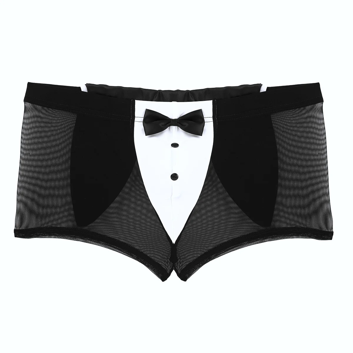 Мужские официанта смокинг белье шорты-боксеры прозрачные сетчатые трусы-боксеры, нижнее белье, трусы, нижнее белье с задней кроличьи уши мужской Косплей Пижама