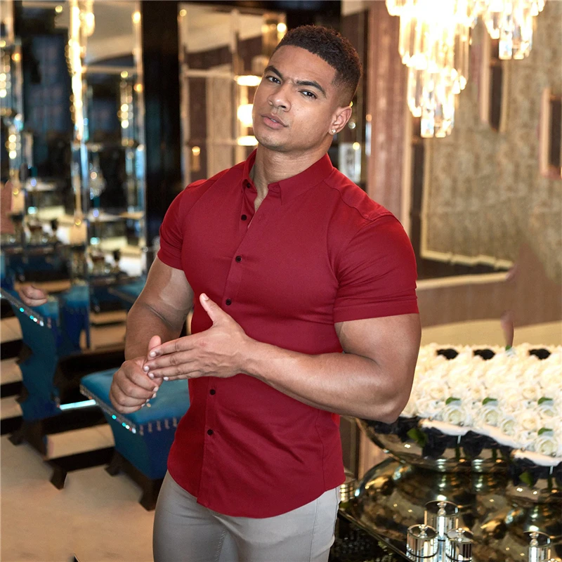 Летняя модная мужская рубашка с коротким рукавом, однотонная мужская рубашка для фитнеса с отложным воротником, Супероблегающая деловая рубашка на пуговицах, топы для спортзала