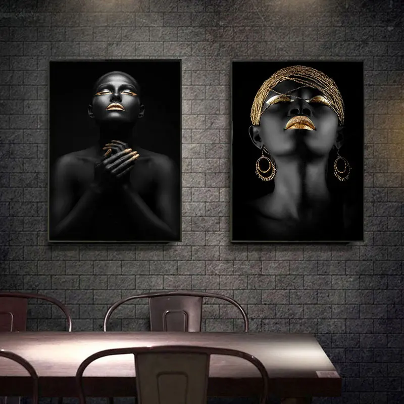 Золотистая и черная современная модель для макияжа, африканская фотостена, искусство, модные постеры для девушек, принты для гостиной, домашний декор