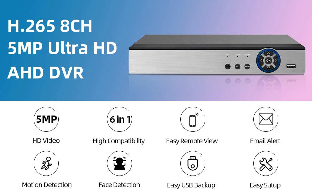 1.H.265 8CH AHD цифровой видеорегистратор;2, Ультра HD 5 Мп дисплей высокой четкости, расширенное H.265 Сжатие видео;3. Поддержка CVBS,AHD,TVI,CVI ,XVI,IP ,6 в 1 Гибридный вход;4. Поддержка распознавания лиц, записи лиц, воспроизведения лиц;5. Поддержка выхода VGA, аудиовхода и аудиовыхода;6. Поддержка режима ночного видения Ultra HD;7. Поддержка 3,5 "дюймовый жесткий диск;8. Поддержка обнаружения движения, оповещения по электронной почте, воспроизведение видео, протокол onvif и многоязычный;9. Поддержка Android,Iphone,Ipad,PC,VMS,P2P view;10. Поддержка Plug and Play, простота установки;11. Удаленный доступ в любом месте, в любое время;