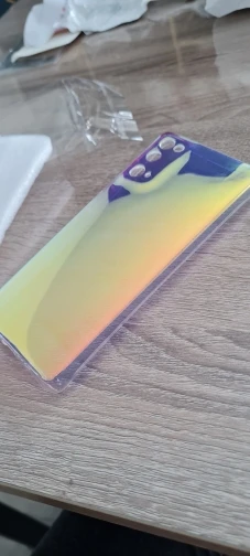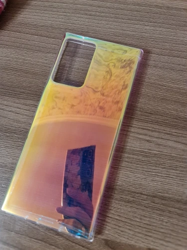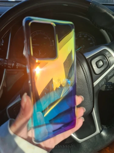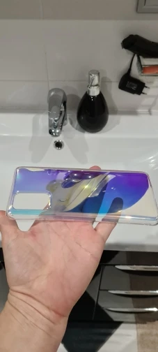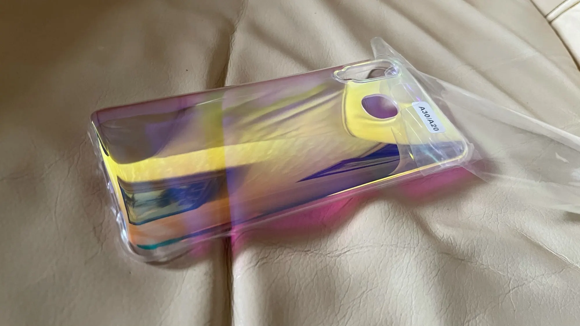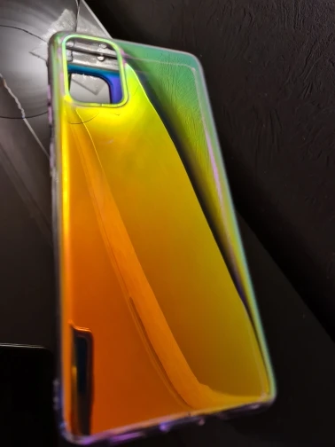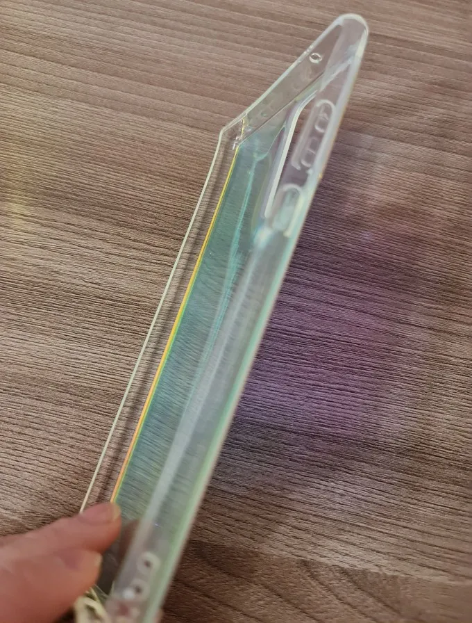 Чехол на самом деле более прозрачный, выглядит по-разному. Цвета не такие яркие, как на фотографиях. Прозрачный чехол с светлым радужным покрытием, отражающим несколько цветов, но не настолько приятный, как на фотографиях, показанных на прослушивании этого товара.