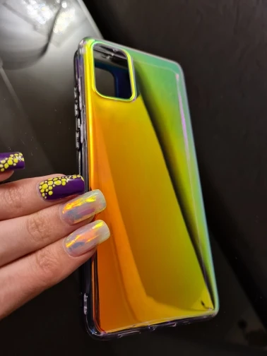 чехол радужный, выглядит интересно, как на картинке. по качеству лучше, чем обычные силикованные, прочнее. не нравится, что стоит чуть подержать в руке, замызганный сразу, в отпечатках пальцев весь. выглядит неопрятно.