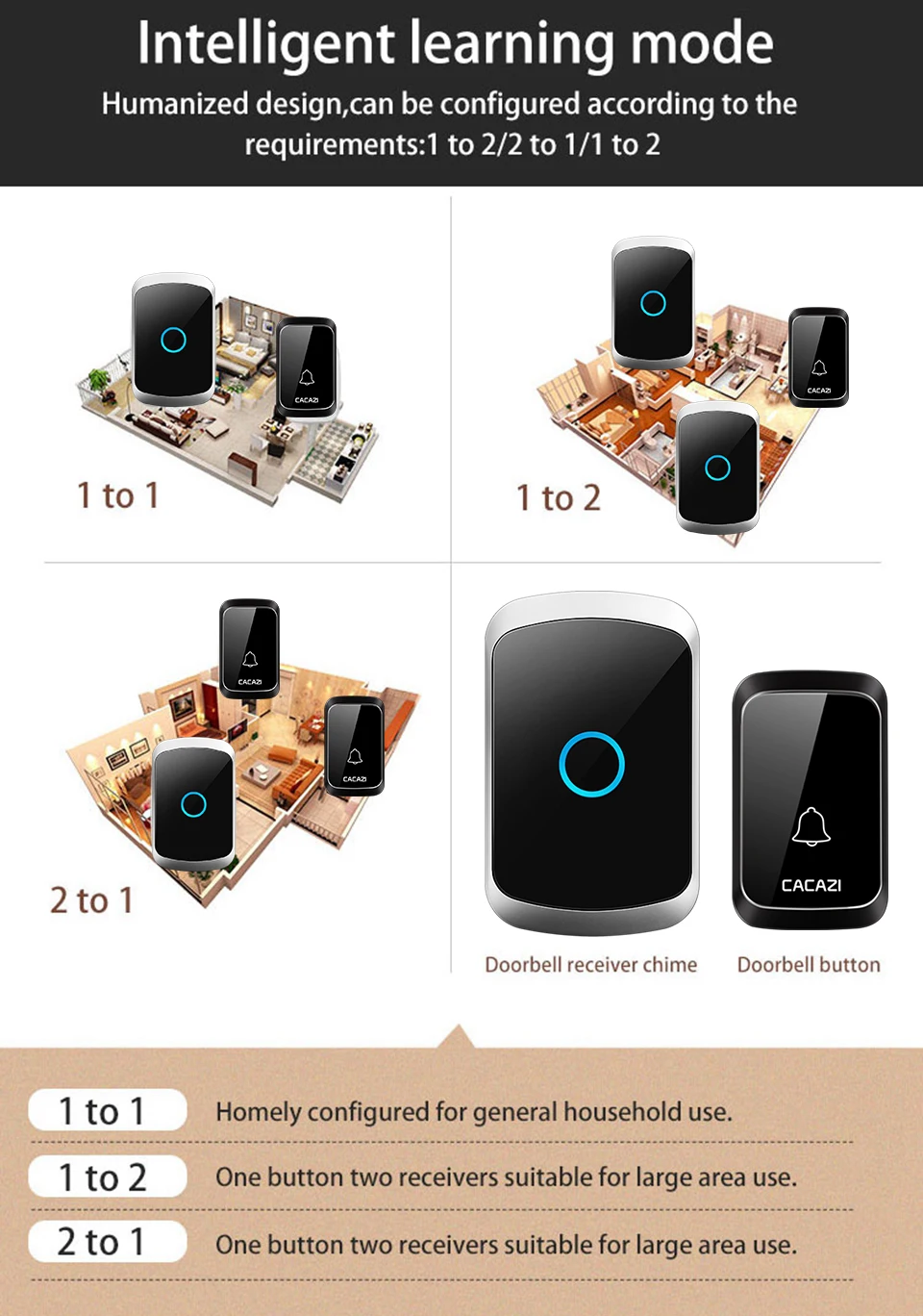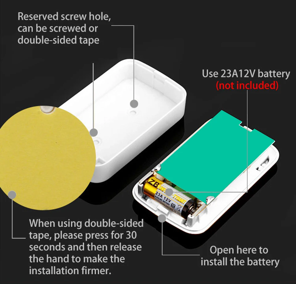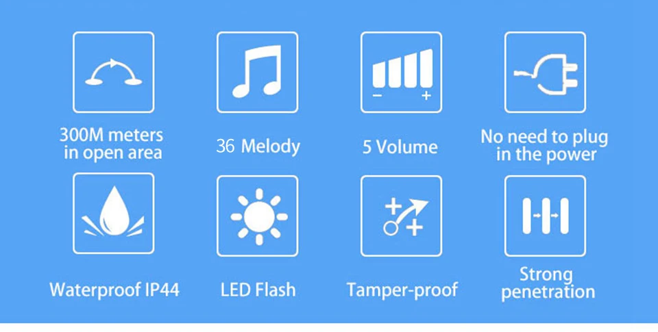 1. Нажмите кнопку, супер код обучения может свободно узнать, чтобы соответствовать, может быть неограниченное соответствие приемника и кнопки. 2. Передатчик без винтового патрона для достижения водонепроницаемости и пыленепроницаемости. 3. Передатчик использует щелочную батарею 23A12V (не входит в комплект). 4. Приемник использует 3 щелочные батареи AA, нет необходимости подключать блок питания, и аккумулятор может быть использован. (не включает батарею). 5. Дальность Приема: 300 м на открытой местности. 6. На беспроводной сигнал будут влиять препятствия. Чем больше препятствий, тем тяжелее потеря сигнала. 7. Приемник имеет 5 уровней (может быть отключен) 0-110 дБ, 36 музыки на выбор. 8. Размер передатчика: 77*51*20 мм 9. Размер приемника: 95*65*24 мм 10. Приемник можно повесить на стену или разместить на столе, в любом месте, кнопочный передатчик можно приклеить его к двери с помощью клейких лент. Примечание: Кнопка не может быть размещена на железной двери, потому что это будет мешать сигналу. Если приемник не звонит при нажатии на кнопку после получения дверного звонка, пожалуйста, проверьте шаги: 1. Пожалуйста, подтвердите, имеет ли кнопка установленную щелочную батарею 23a12в. 2. Проверьте, имеется ли в приемнике 3 * AA щелочная батарея. 3. Пожалуйста, соедините дверной звонок снова.