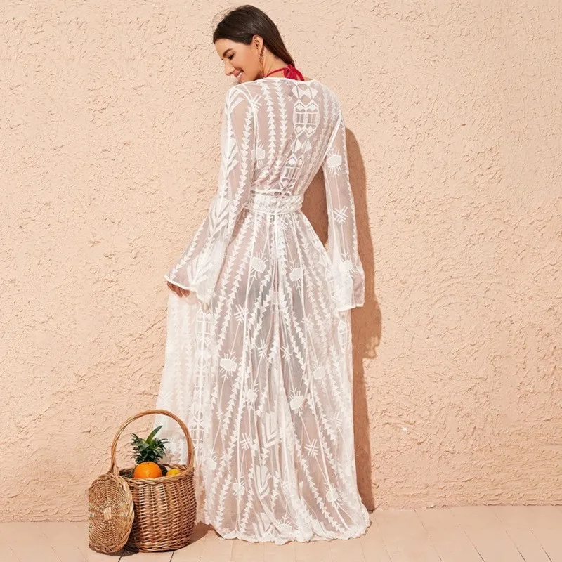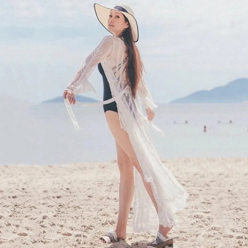 2021 Для женщин Купальник Пляжная накидка кардиган с длинными рукавами; Блузки с лентами, накидка, Восточный халат, Пляжное кружевное платье халат однотонные белые бикини прикрытие Vestido