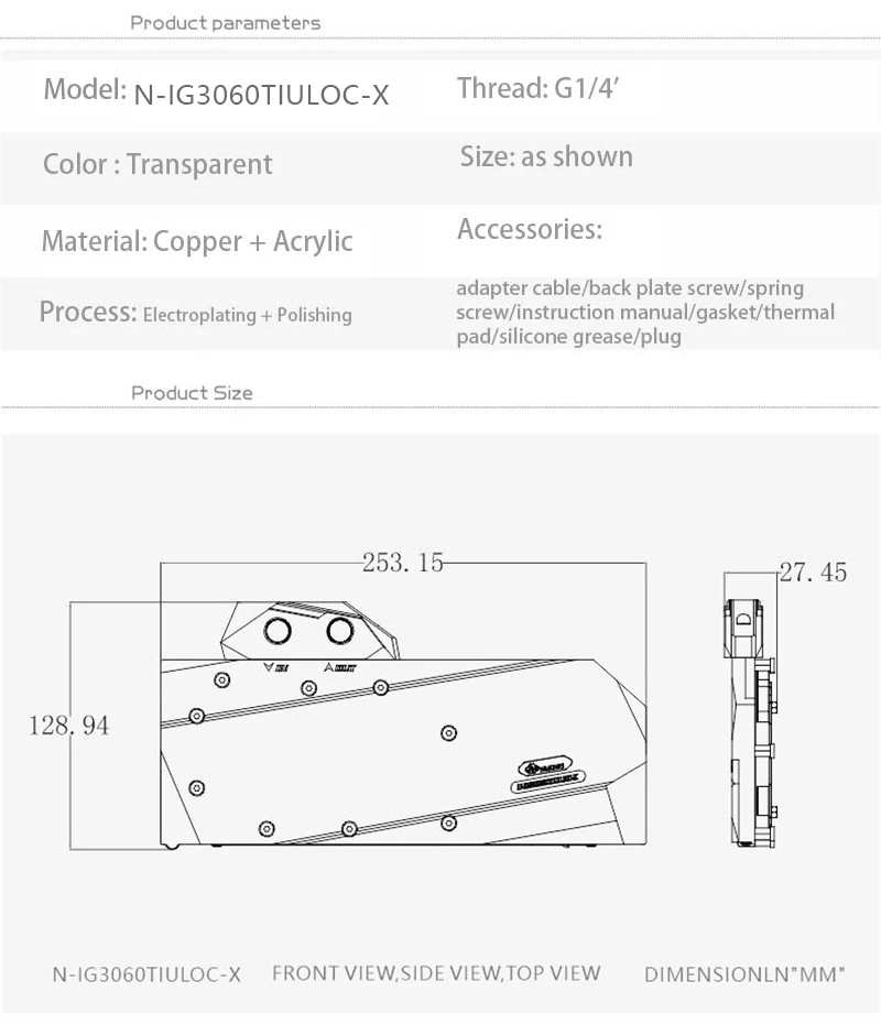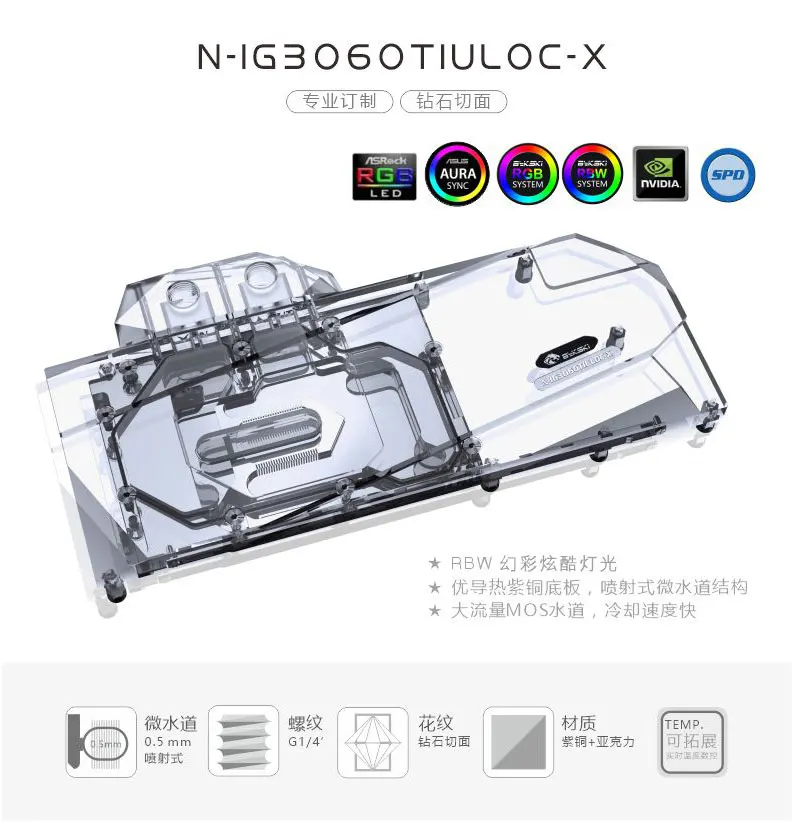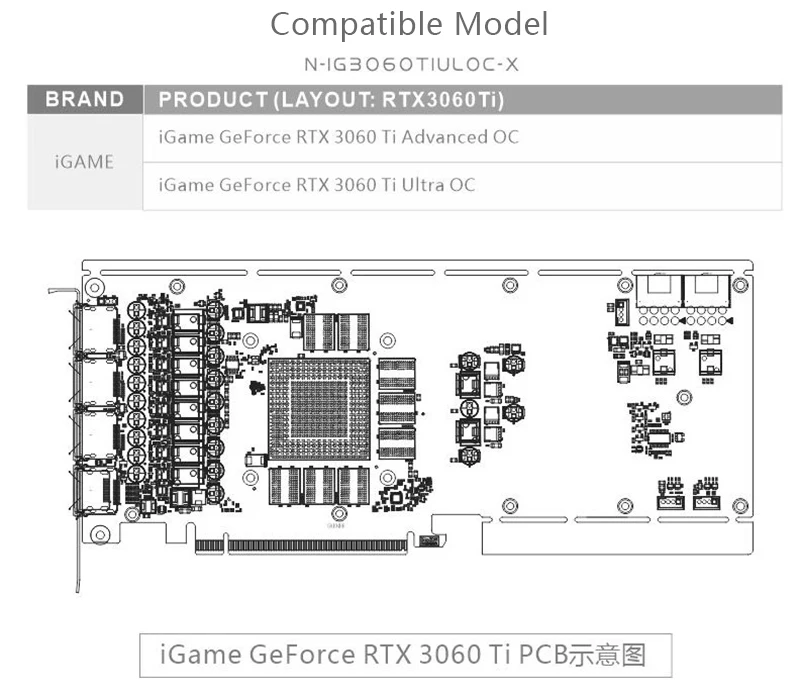 Петля: неалюминиевая(Включая, но не ограничиваясь следующими моделями)IGAME RTX 3060 Ti Advanced OCIGAME RTX 3060 Ti Ultra OCСовместимость основана только на справочном дизайне, блок может не соответствовать измененным/супер-разгонным и другим вариантам третьей стороны, которые отличаются от эталонного дизайна.Фитинги: Резьба G 1/4Стоковые бэкплейты: из-за разницы в монтаже между картами, стоковые бэкплейты не гарантированно подходят.