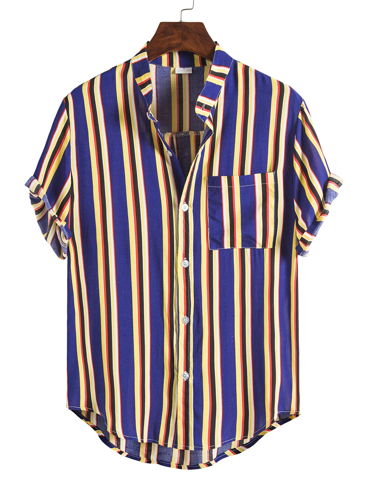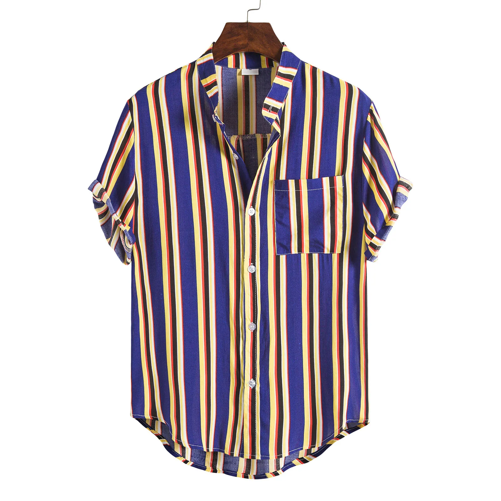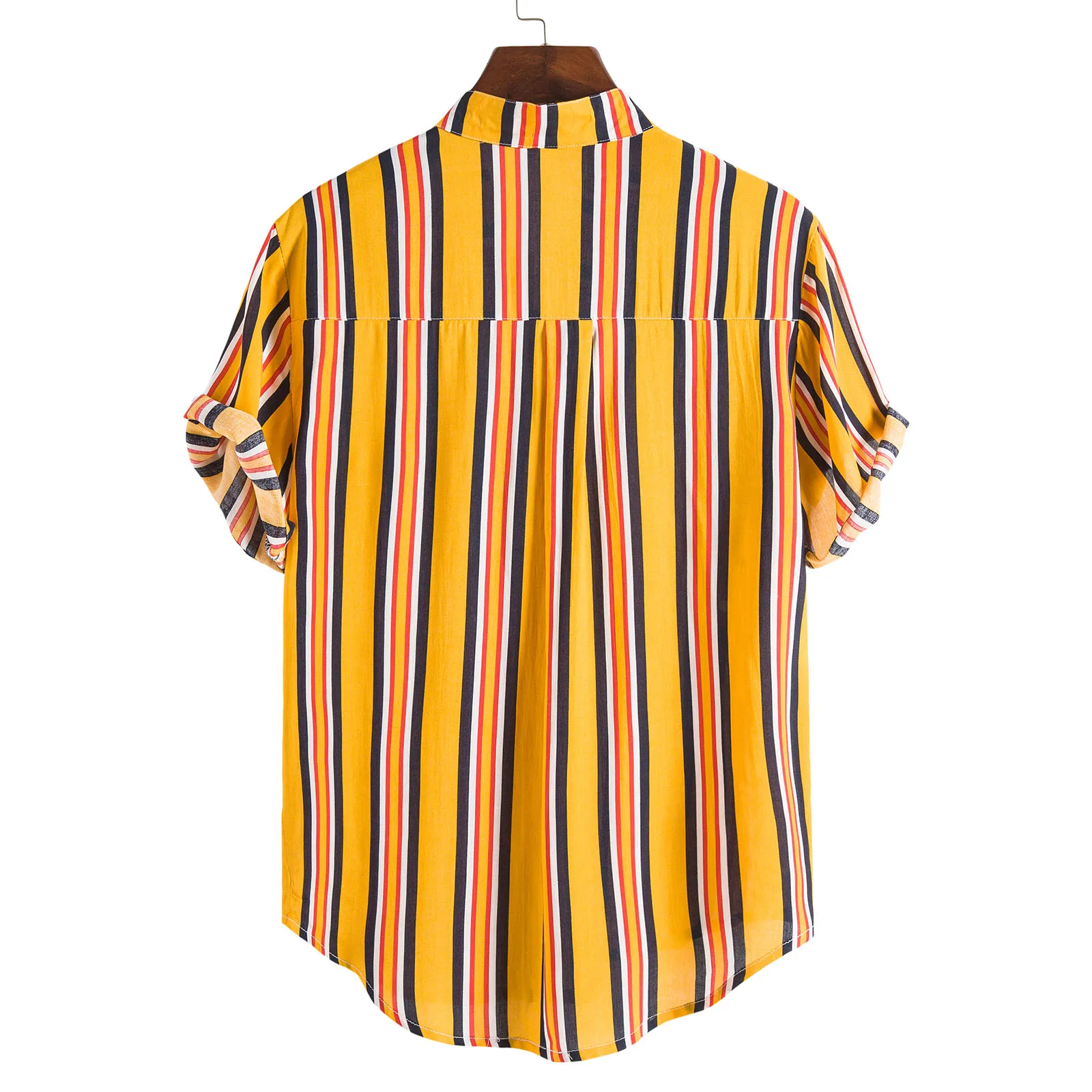 Мужская рубашка в полоску, рубашка с отложным воротником и коротким рукавом, темно-синяяжелтаякрасная, для лета и осени