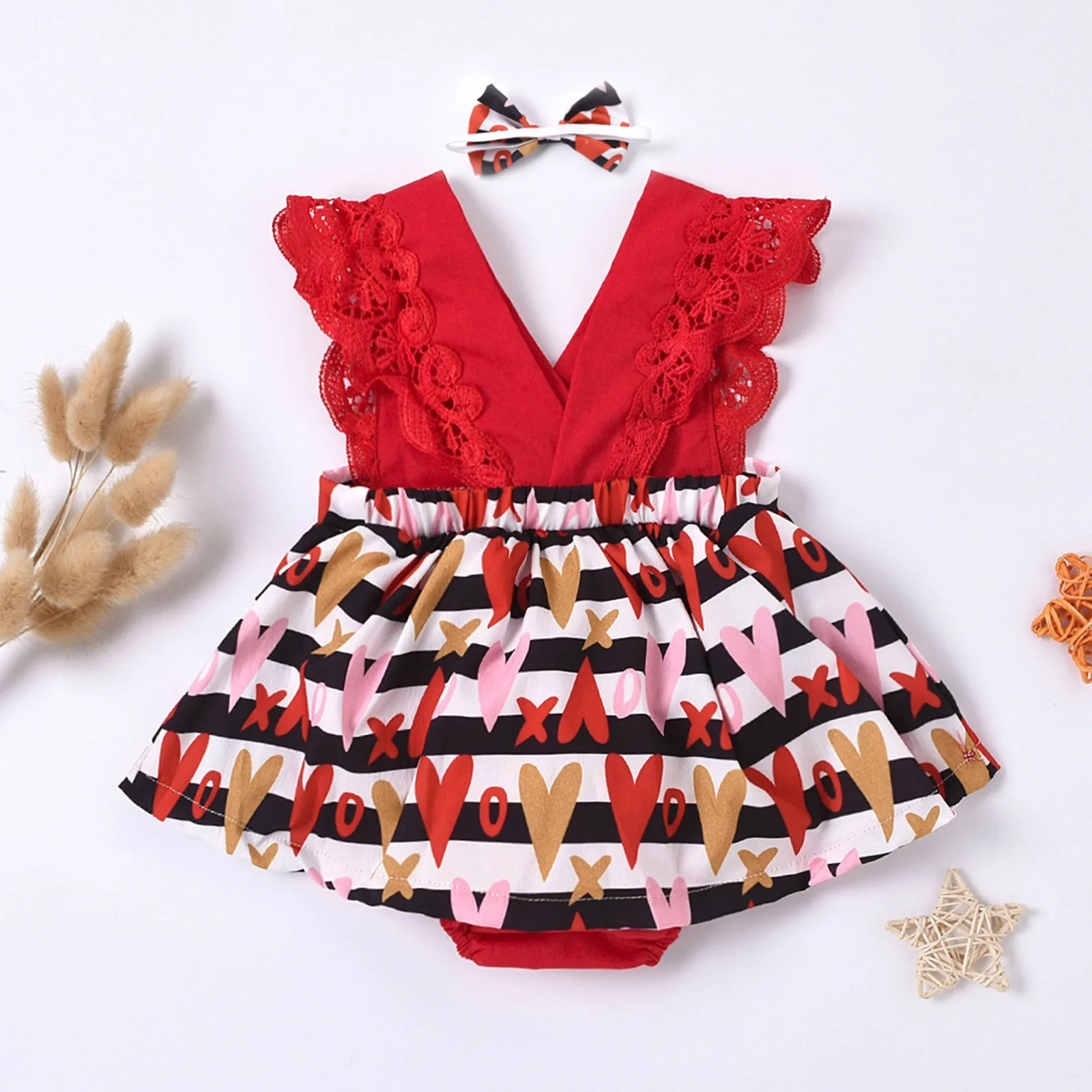 Милые детские штаны с кружевом и комплекты с платьем; Ко Дню Святого Валентина для малышей и детей постарше, без рукавов, рисунок, комбинезон + повязка на голову, комплект одежды ropa para Детские nia