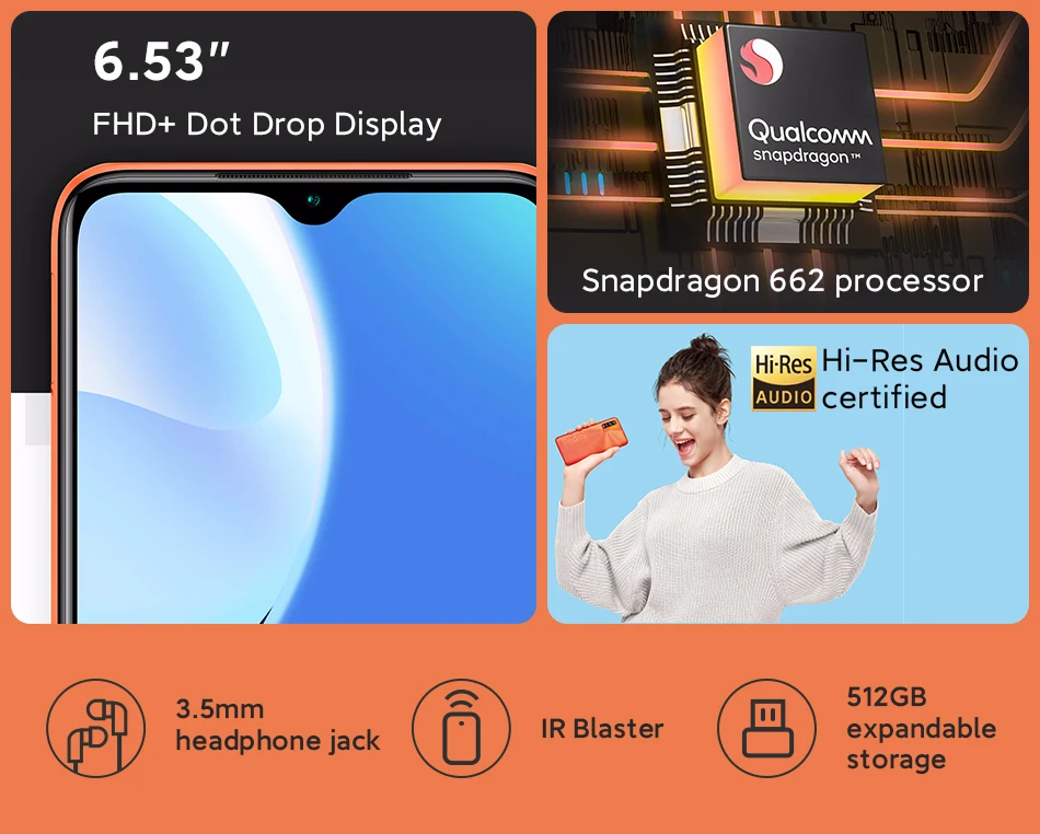 Snapdragon 662Восьмиядерный | 48 МП AI quad camera | 6Аккумулятор 000 мАч (typ) | 6,53 "FHD + DotDisplay