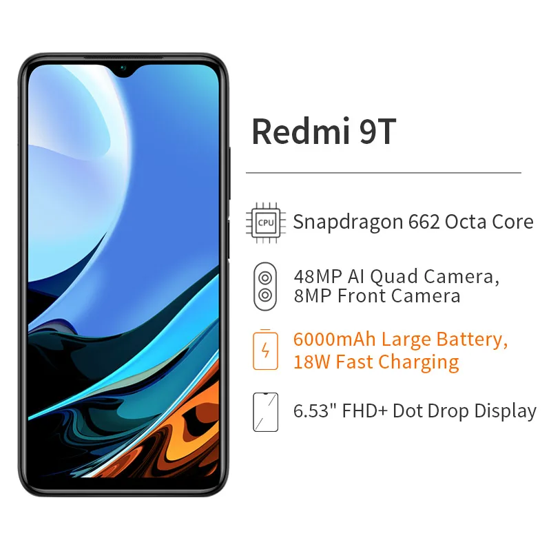 Смартфон Xiaomi Redmi 9T, 64 ГБ128 ГБ, Аккумулятор 6000 мАч, Восьмиядерный процессор Snapdragon 662, экран 6,53 дюйма, камера 48 МП, быстрая зарядка 18 Вт