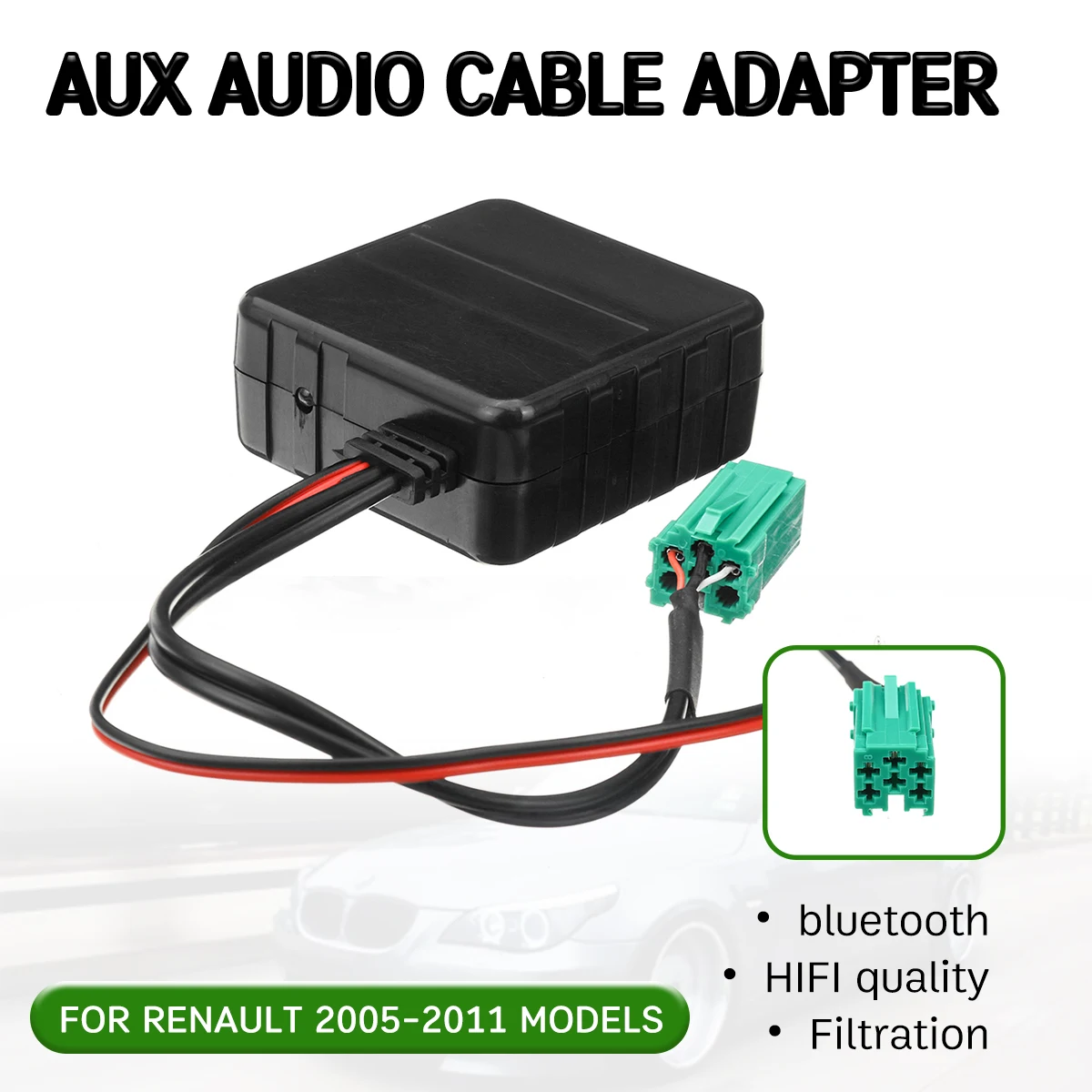 > Краткое описание продуктаМодуль помогает воспроизводить музыку, хранящуюся на bluetooth-устройстве, на радио через беспроводную передачу, что решает проблему, что из-за отсутствия резервных аудио входных портов и неудобств в использовании сигнальных кабелей в автомобильном стерео. Примечание1. Пожалуйста, подтвердите,Стерео содержит AUX или дополнительный criginal интерфейсПеред покупкой. Вы можете связаться с нашим персоналом, чтобы узнать более подробную информацию о модуле или взять Электронное руководство, спасибо!2. Этот тип модуляНе поддерживает звонки без рук: Он не поддерживает ответ/повесить и т. Д. С помощью автомобильных кнопок радио и кнопок рулевого колеса3. Этот модульНе поддерживает управление bluetooth AVRCP: Он не может быть с помощью автомобильных кнопок радио или кнопок рулевого колеса для Prev/Next Track, пауза/воспроизведение, быстрая вперед/назад > Характеристика1. Plug & Play: устанавливается через Оригинальный порт переключения компакт-дисков, легко и быстро, идеально интегрируется с автомобилем.2. Беспроводное воспроизведение A2DP:Легко передавать музыку для устройств bluetooth в автомобильную стереосистему фабрики.3. Hifi Качество звука:Подключен к автомобильному стерео через проводную проводку, без помех и без потери качества звука, в отличие от оригинального CD-звука.4. Позвольте вам легко получить популярную конфигурацию усовершенствованного автомобильного стерео, это лучший выбор для безопасного вождения и прослушивания цифровой музыки. СпецификацияВходное напряжение:4,5 V ~ 14,6 V DCРабочий ток:600 мАТок в режиме ожидания:20 мАРазрешение DAC:20 битПолное гармоническое искажение:0.05%Коэффициент SN:90 дБЧастотная характеристика: 20 Гц-20 кГц > Совместимые моделиСовместим только с радиостанциями «Update List» и радиостанциями CARMINAT на следующих моделях: Для Renault Clio (модели с 2005 по 2011)Для Renault Espace (модели с 2005 по 2011)Для Renault Kangoo (модели с 2005 по 2011)Для Renault Laguna (модели 2005-2011)Для Renault Megane (модели с 2005 по 2011)Для Renault Scenic (модели с 2005 по 2011)Для Renault Trafic (модели с 2005 по 2011)Для Renault Twingo (модели с 2005 по 2011)Для Renault Modus (модели с 2005 по 2011)Для Renault Master (модели 2005-2011) Не работает для радиоприемников Renault с экраном или GPSНе работает для моделей Renault до 2005 года Этот адаптер будет работать только для радиоприемников Renault «Обновить список», которые имеют «aux' вариант, указанный в меню обновления. Большинство автомобилей имеют этот тип радио, но есть несколько с головным устройством типа «тюнер», с которым этот кабель не будет работать. Этот адаптер все еще может использоваться, если у вас уже есть CD-заменитель, подключенный к радио, так как он использует другой socke > Посылка в комплекте1x для bluetooth aux кабеля