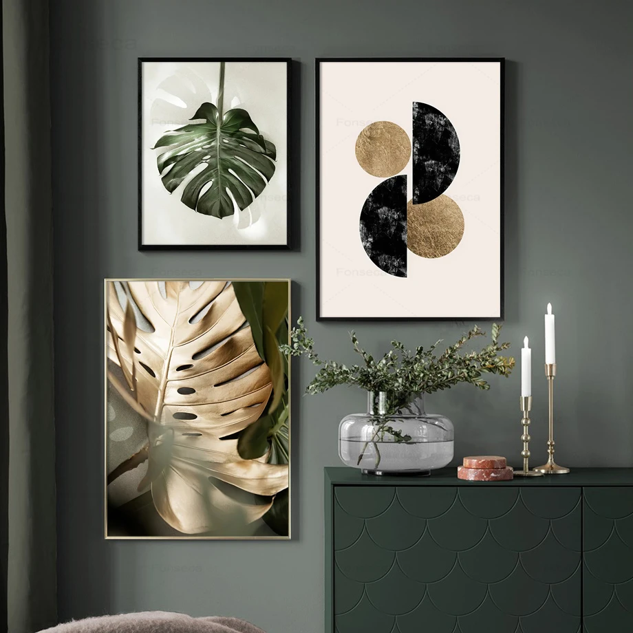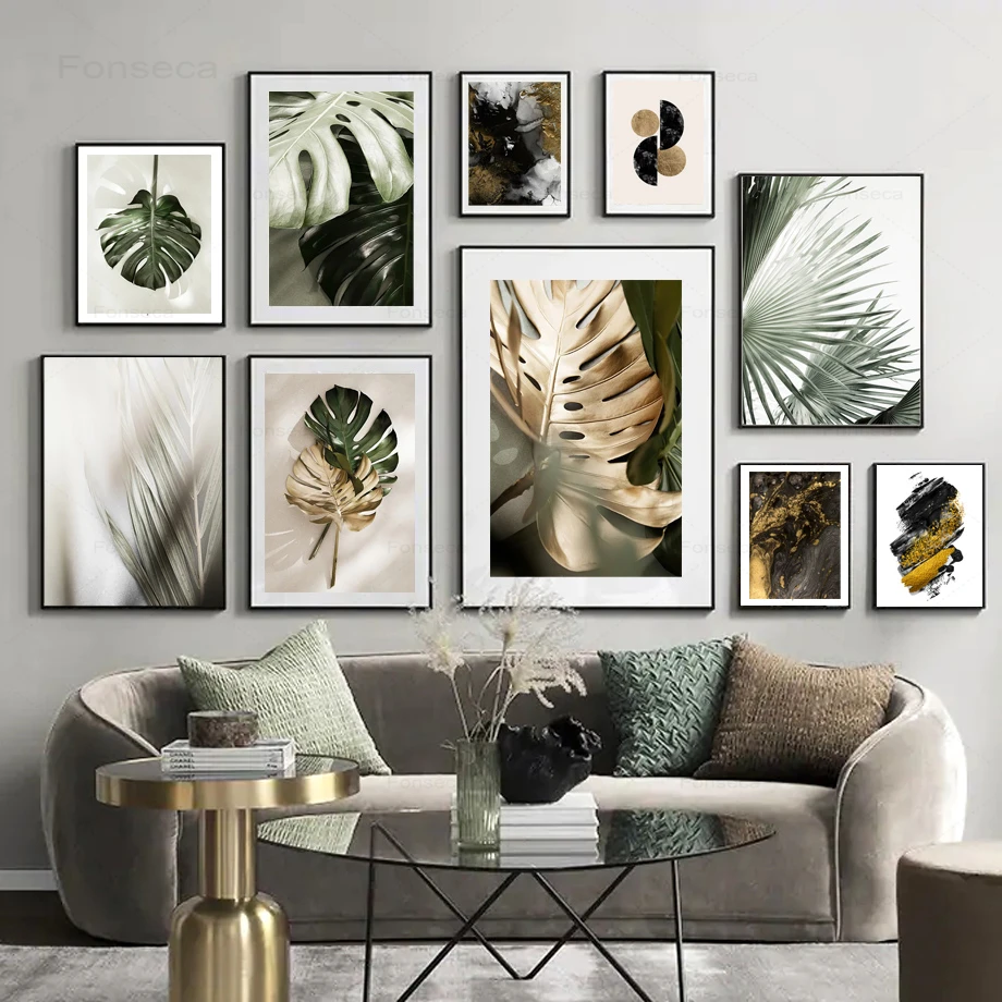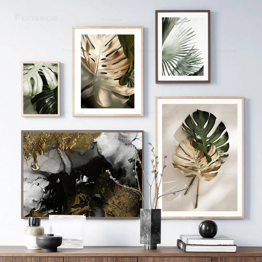Настенная картина с изображением золотых листьев на холсте, современный скандинавский постер с изображением монстеры, дымчатой пальмы, настенные картины для гостиной без рамки