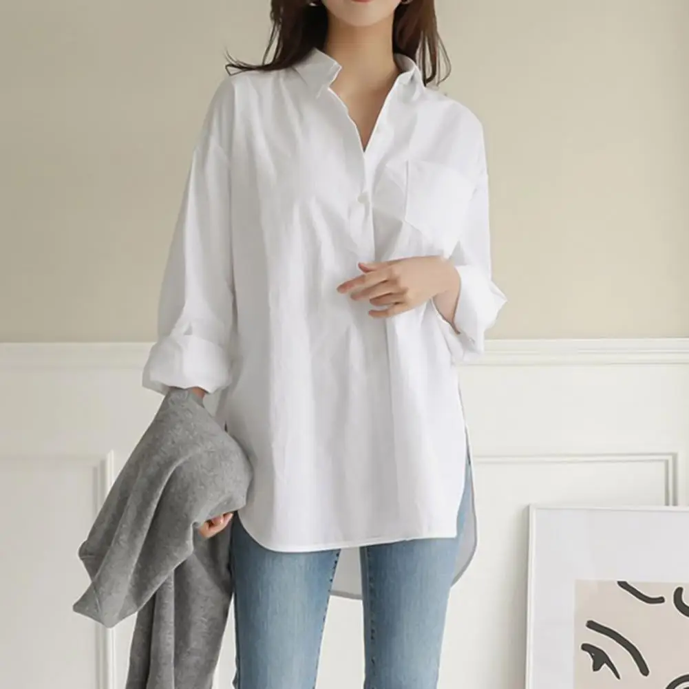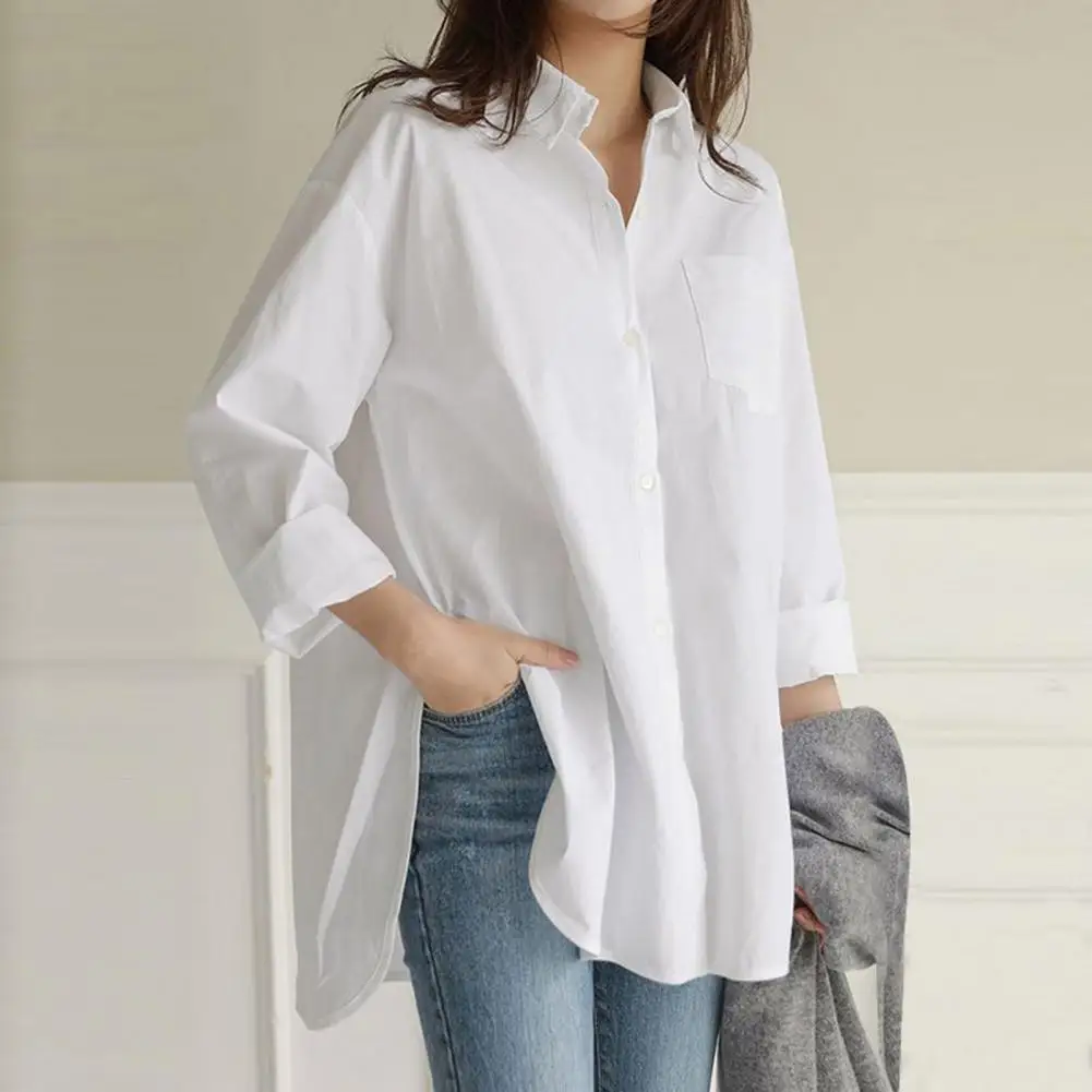 Рубашка женская оверсайз в Корейском стиле, белая однотонная блузка свободного покроя с карманами, весна-осень 2021