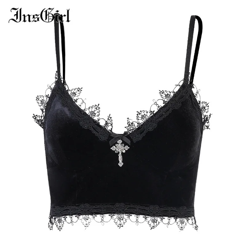 Майка InsGirl в стиле Харадзюку, пикантная бархатная в готическом стиле, Женская Эстетическая майка темного цвета, укороченная майка в стиле эмо, гранж-панк, Y2k