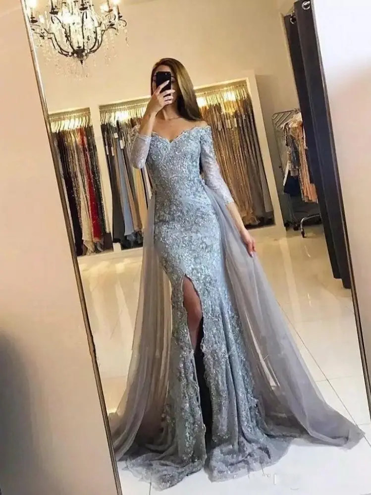 Серебряные мусульманские Вечерние платья 2021 Русалка с рукавами 34 кружевное с разрезом Тюль с V-образным вырезом Дубай Кафтан Саудовский арабский длинный вечерний наряд