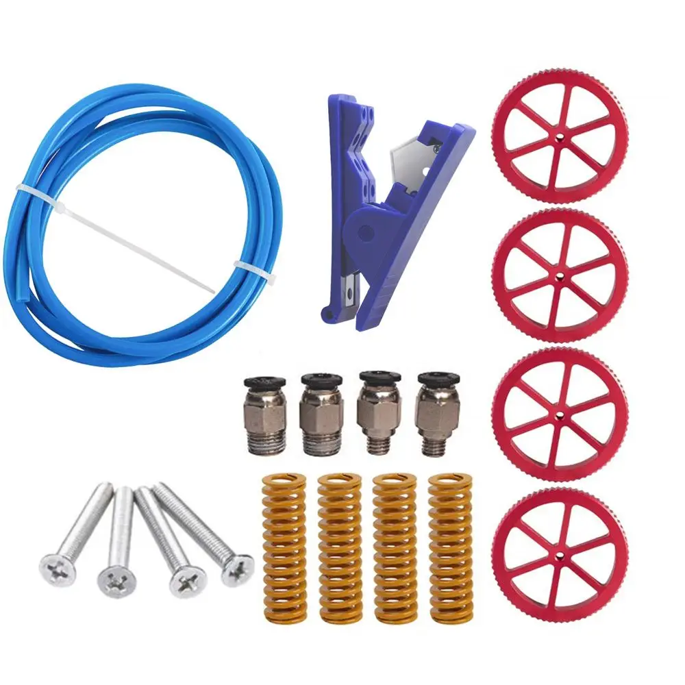 1. 4 * модернизированная алюминиевая гайка с ручным поворотом. Эти красные Алюминиевые гайки являются оригинальной обновленной запасной частью для Ender 3/3 Pro/3 V2, Ender 5/5 Plus/ 5 Pro, CR-10, CR-10 V2, CR-10 Max, CR 10, CR-10 Mini, CR-10S, CR 10S Pro, CR-10 Plus, CR-X, CR 20.2. 1*1 метр оригинальный Козерога XS серьезные Bowden PTFE трубки с самым низким трением на рынке. Меньшее трение означает более отзывчивость, меньшее вытягивание, более точные принты, меньшее проскальзывание, износ и разрыв на экструдере и меньшее засорение при печати массивных нитей, таких как некоторые древесные или железные плиты.3. 4 * пружина горячей кровати. Примечание: пружины длиной около 25 мм, что больше, чем у принтеров ender 3, ender 3 pro и ender 3 v2. Если вам действительно нравится этот продукт, вы можете использовать инструмент, чтобы сократить его, чтобы быть короче или отрегулировать горячую кровать, чтобы быть выше, чтобы соответствовать пружинам.4. 4 * M4X35 винты для горячей кровати. Примечание: длина винтов составляет 35 мм, если у вашего принтера имеются винты с горячим слоем 40 мм, пожалуйста, отрегулируйте горячую кровать ниже и повторите выравнивание для печати.5. Пневматический соединитель 2X PC4-M6 и 2X PC4-M10 изготовлен из brasss, с маленькими металлическими зубцами, которые могут плотно соединяться. Таким образом, это никогда не протекает нить во время печати.6,1 * резак для трубопровода Bowden.
