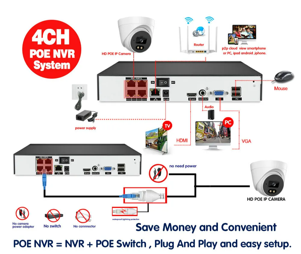 Никаких дополнительных силовых кабелей или адаптеров не требуется, просто подключив IP-камеру к сетевому видеорегистраторУ с помощью одного кабеля, вы можете легко завершить установку, не зная о компьютере или сети, и начать наслаждаться супер легким мониторингом среди вашего смартфона, планшета или ПК.