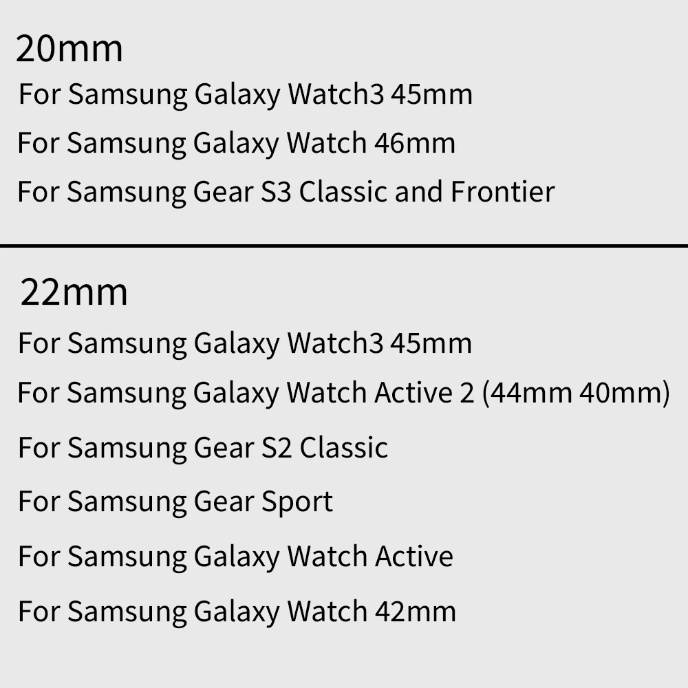 Пожалуйста, выберите необходимый вам размер (22 мм или 20 мм) в соответствии с моделью часов ниже 22 мм Для Samsung Galaxy Watch3 45 мм Для Samsung Galaxy Watch 46 мм Для Samsung Gear S3 Classic и Frontier 20 мм Для Samsung Galaxy Watch3 41 мм Для Samsung Galaxy Watch Active 2 (44 мм 40 мм) Для Samsung Gear S2 Classic Для Samsung Gear Sport Для Samsung Galaxy Watch Active Для Samsung Galaxy Watch 42 мм