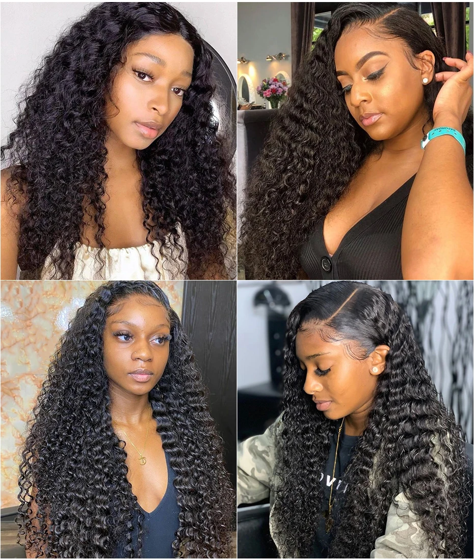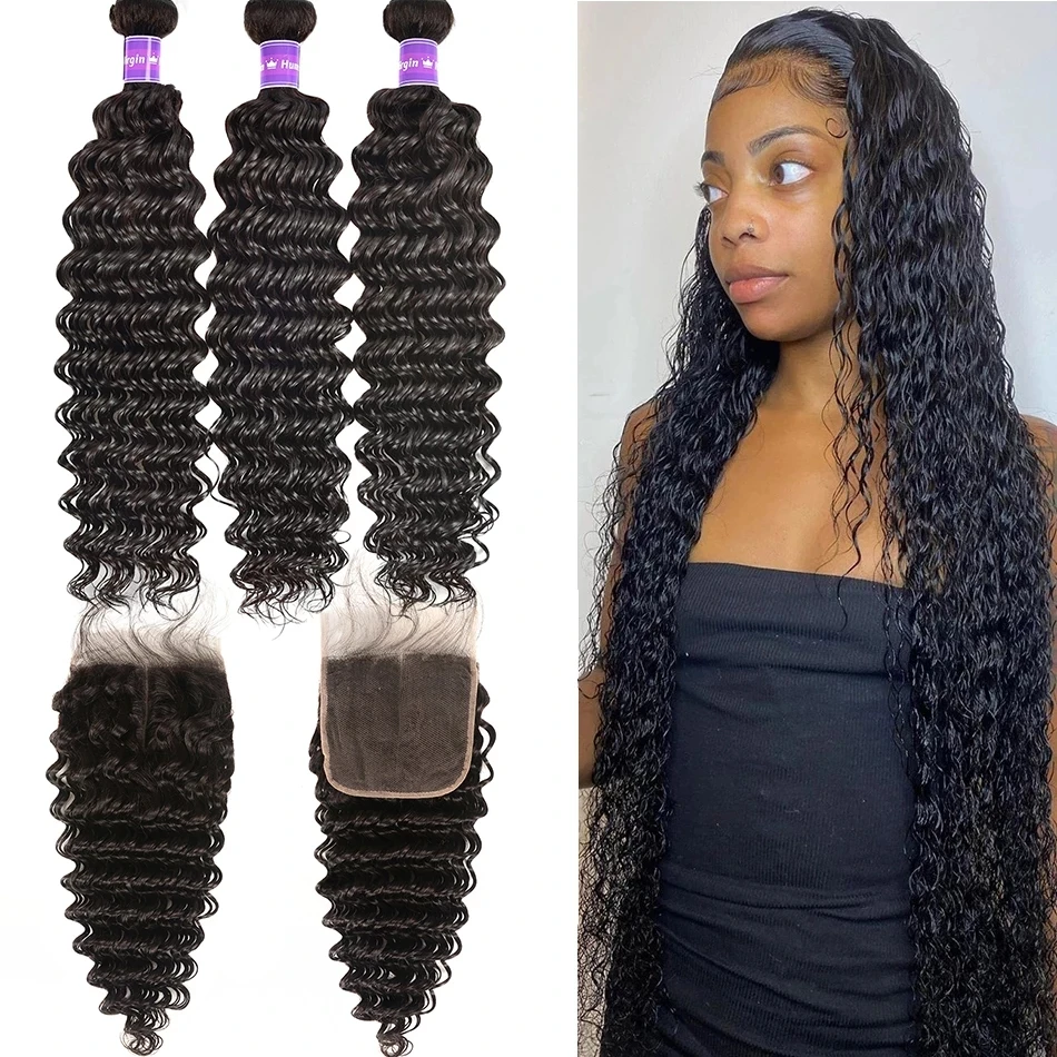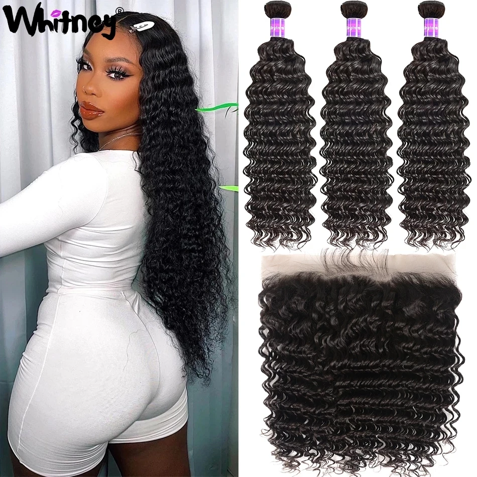 Монгольские человеческие волосы с глубокой волной, пучки с фронтальными натуральными волосами, глубокие вьющиеся HD прозрачные кружевные передние и закрытые с 3 пряди