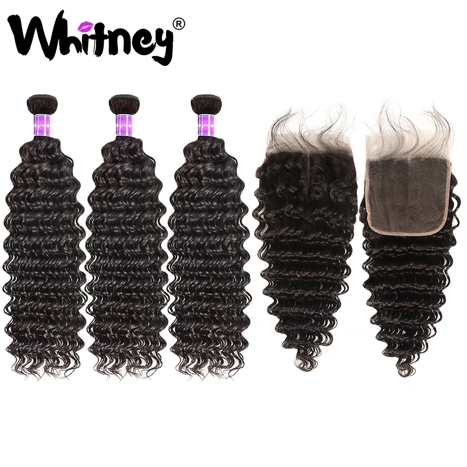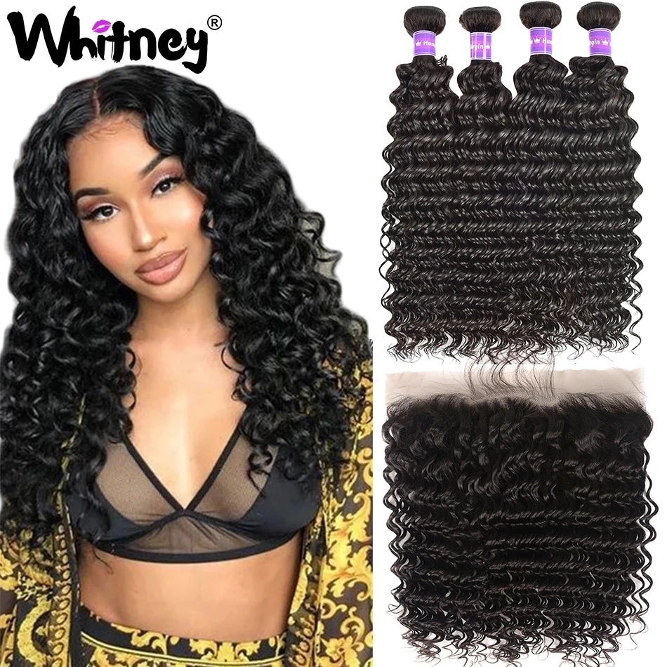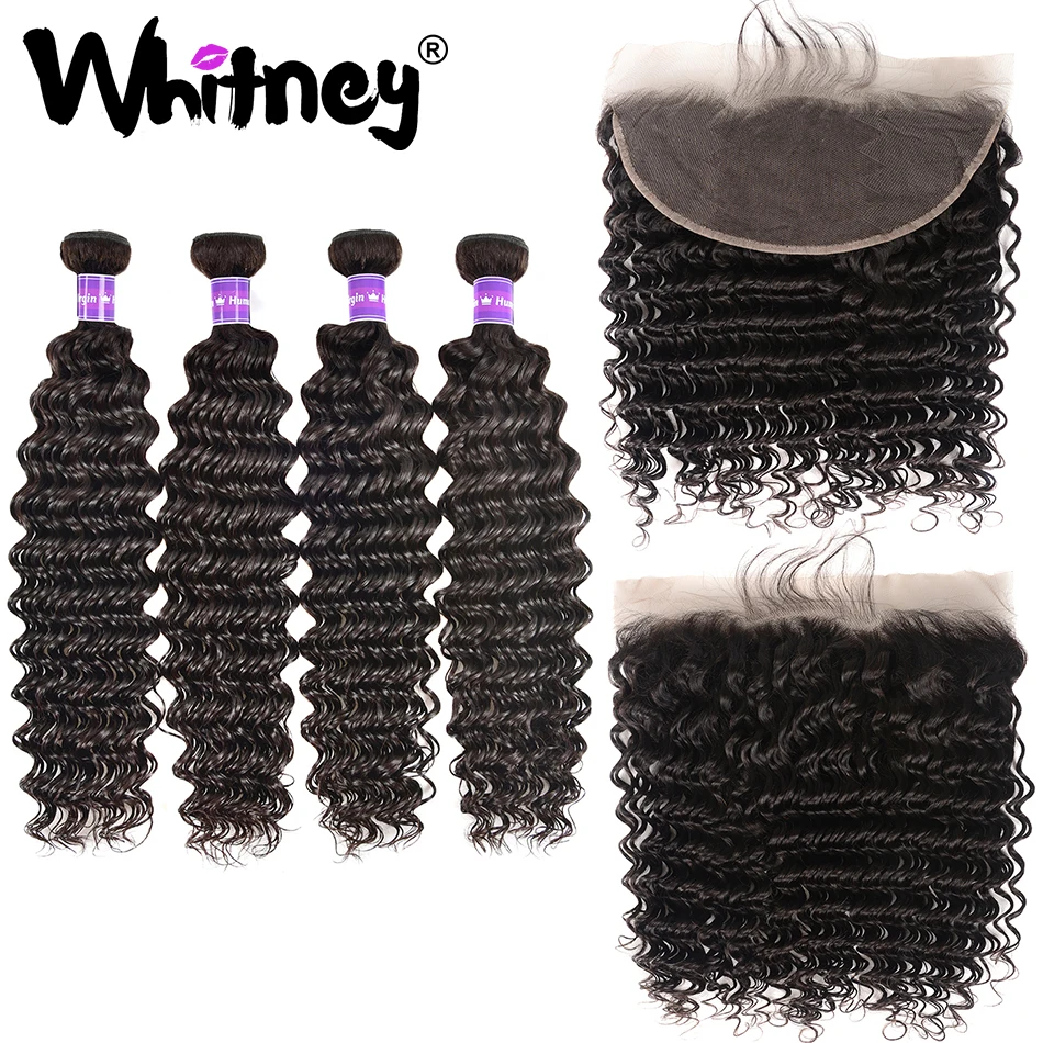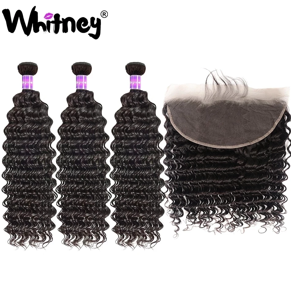 Whitney Малайзии глубокая волна пряди с фронтальной Кружева Закрытие с пряди 100% человеческих волос девственницы 234 пряди для черный Для женщин