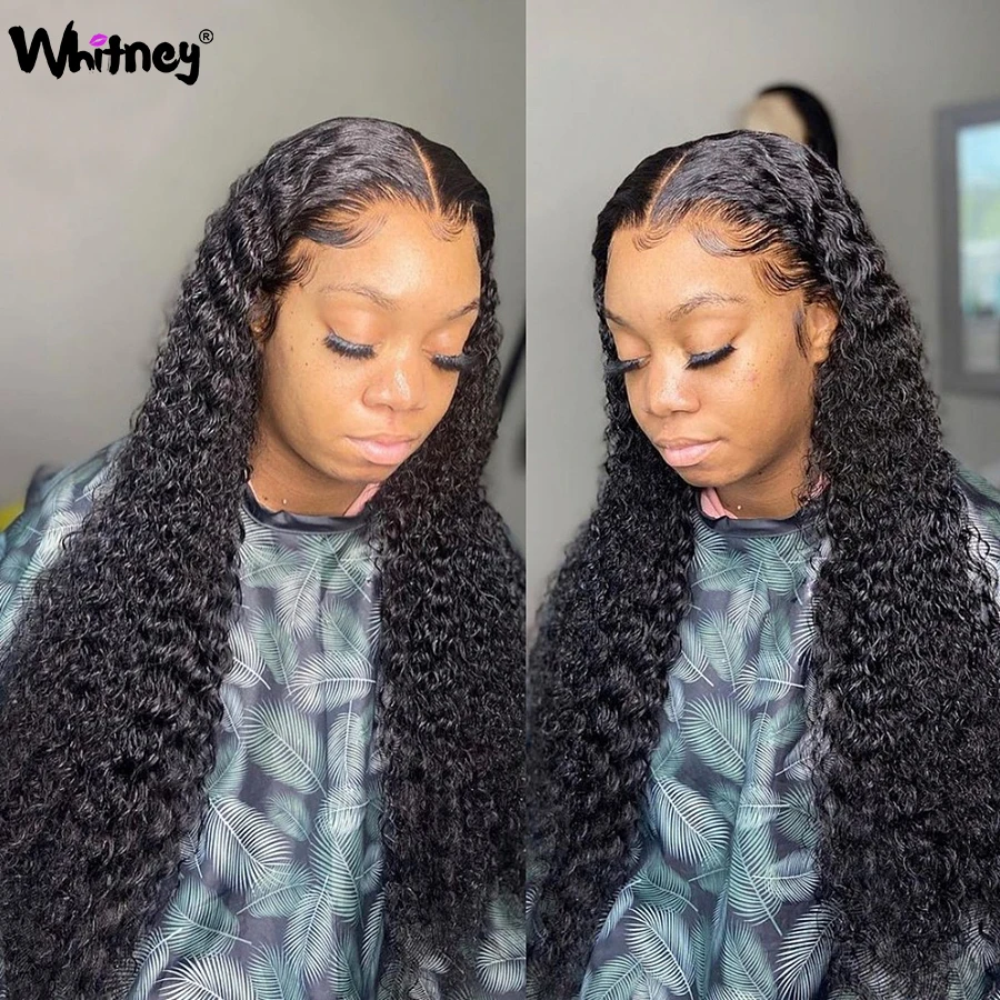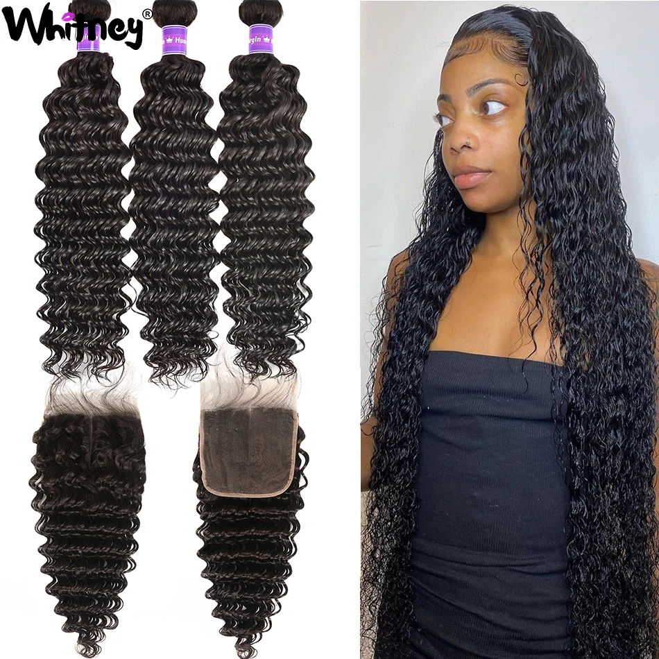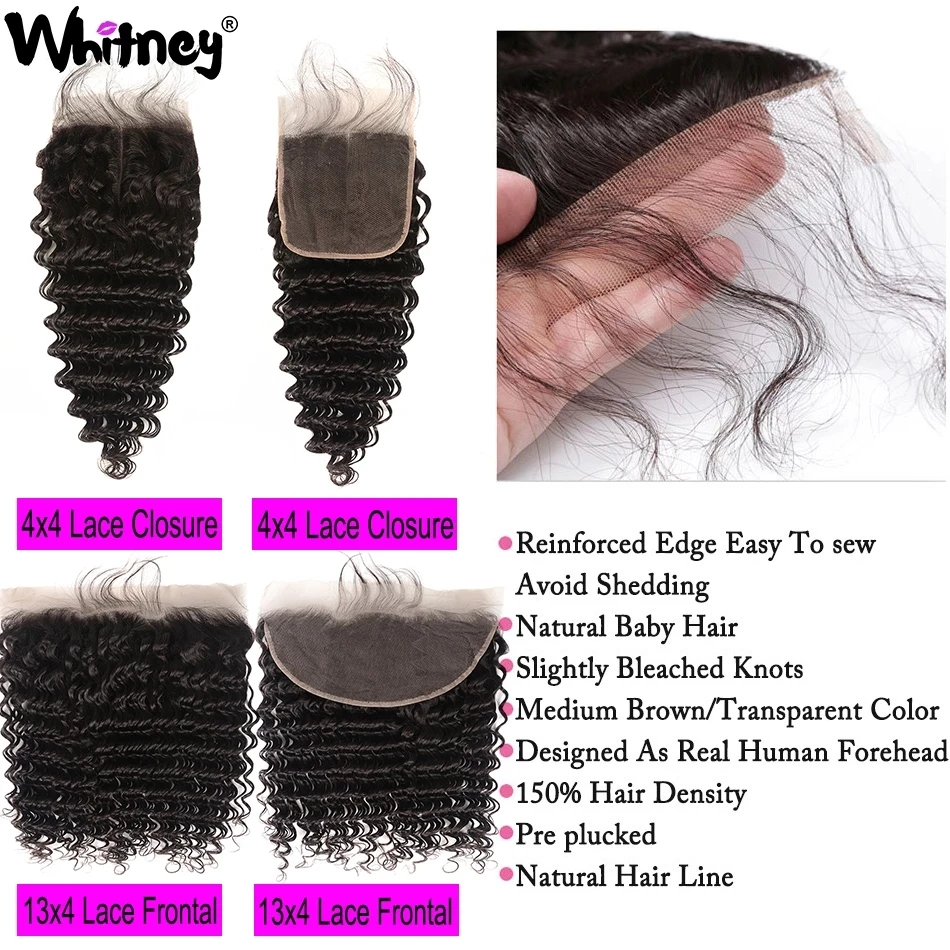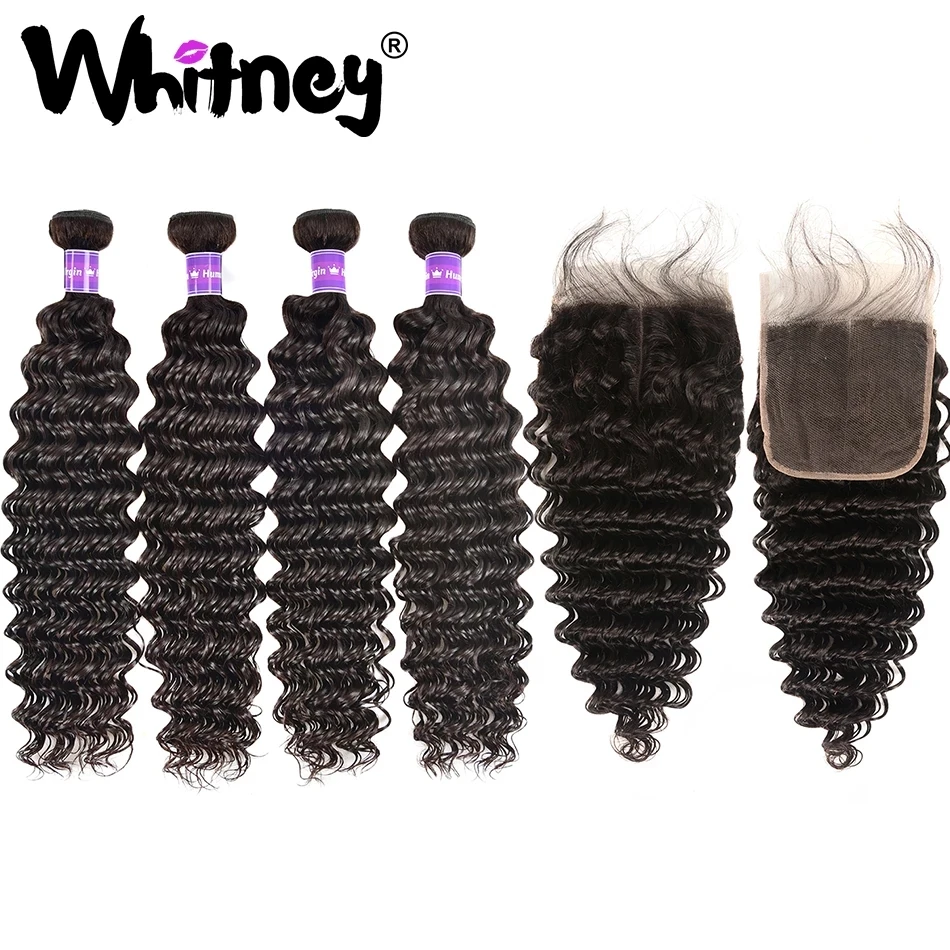 Whitney Малайзии глубокая волна пряди с фронтальной Кружева Закрытие с пряди 100% человеческих волос девственницы 234 пряди для черный Для женщин