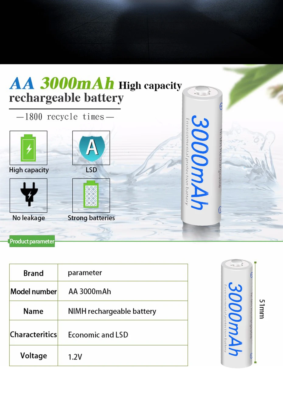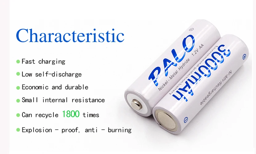 Особенности:Тип: Ni-MH низкий саморазрядНазвание бренда: PALOРазмер: AADimensionDiameter * Высота = 14,5 (-0,5) мм * 50,5 (-1,0) ммНоминальное напряжение: 1,2 VТок: 2000 мАЕмкость: менее 3000 мАчСертификация: CE, ROHS и т. Д.Упаковка: маленькая коробка, пластиковая посылка и т. д.Цикл перезарядки: 1800 раз