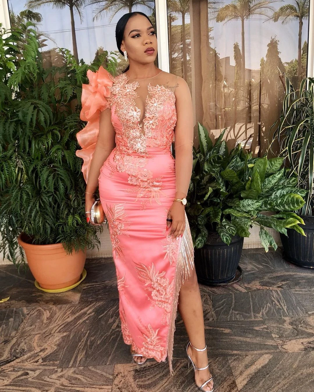 Вечерние платья из органзы, с длинным рукавом, с разрезом, длиной до щиколотки, с бахромой, розового цвета, размера плюс