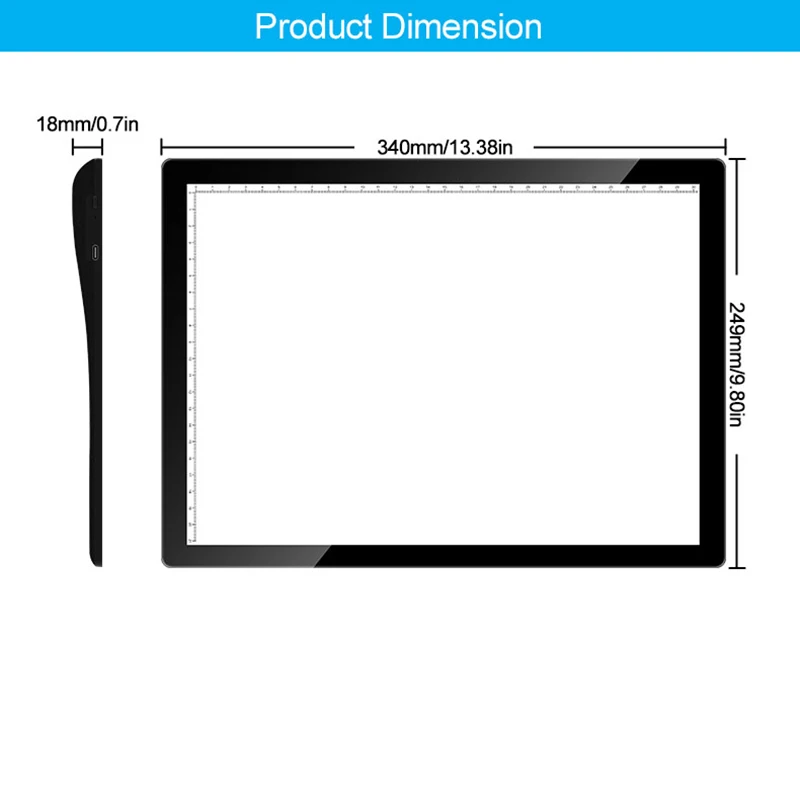 Батареи: литиевая батарея 2500maDinmming:5 уровней затемненияРазмер: 340*249 * ммОсвещенная область: 308*218 ммРабочая поверхность: акриловые панелиСветильник источник света: светодиодныйРабочая Напряжение: 5V/50/60HzПотребляемая мощность: 1,88 ВтИнтерфейс питания: Type-CНаправляющий светильник: светильник-панельРазмер шкалы: ДаПрименение: Трассировка/эскиз/мультфильм/2D Анимация/рентгеновский вид/алмазная живопись