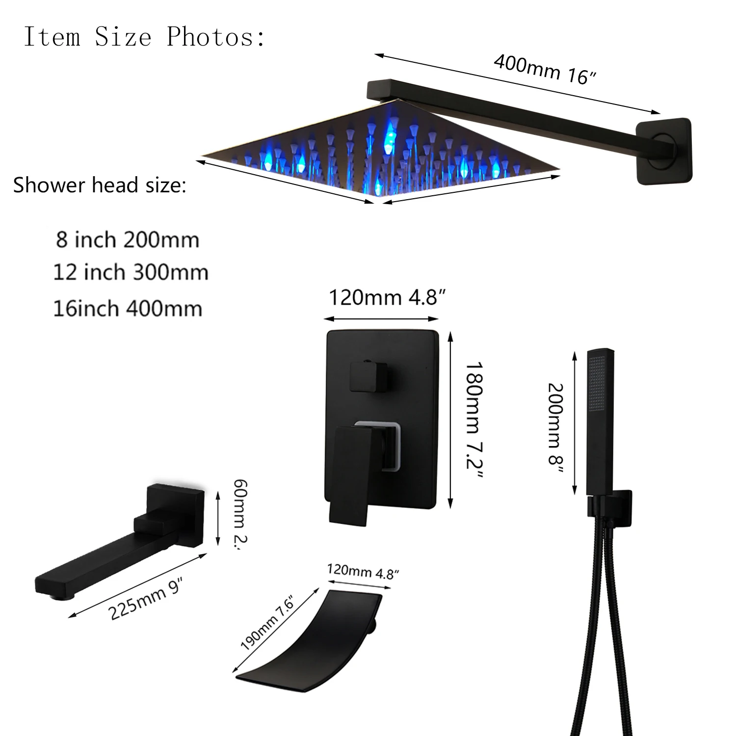 Матовый черный смеситель для душа Monite 8, 12, 16 дюймов, светодио...