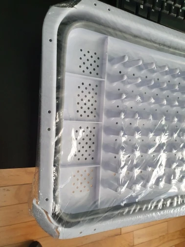Выглядит как на картинке. Это довольно маленький размер, подходит для дома на одного или двух человек. Вода проходит через воду, поэтому вам нужно что-то водонепроницаемое под ним.