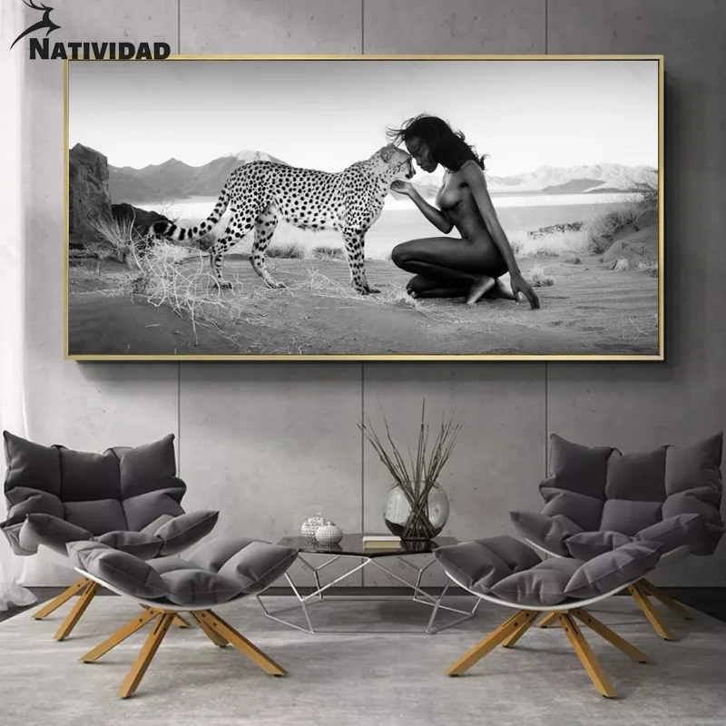 Впечатление Лев Обнаженная сексуальная черная девушка фотография печать художественный плакат дикая п...